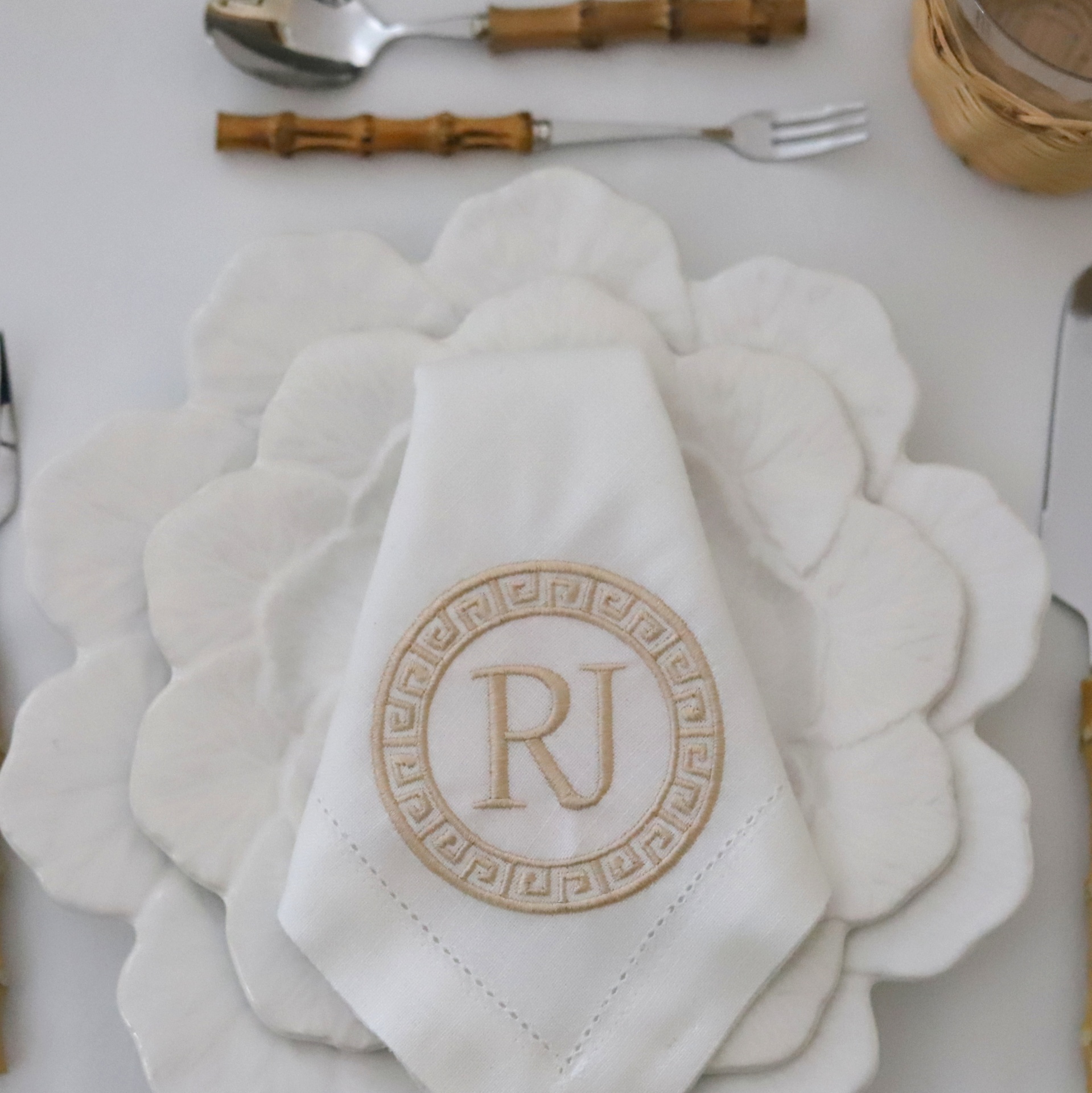 Guardanapo branco bordado RJ sobre prato branco decorativo em forma de pétalas