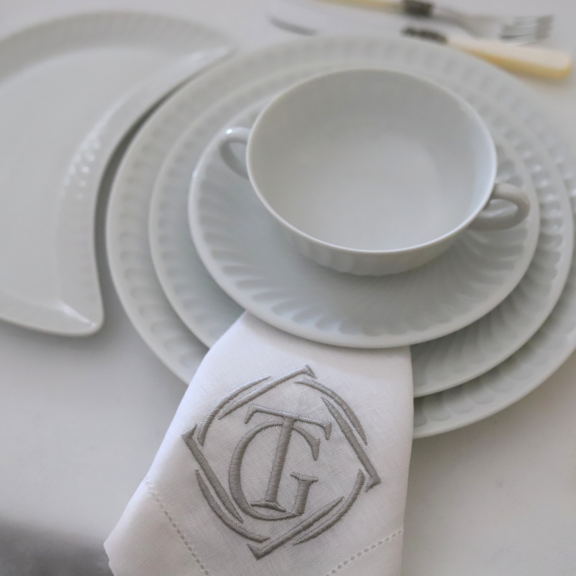 Conjunto de loiça branca com padrão ondulado e guardanapo bordado com letras TG