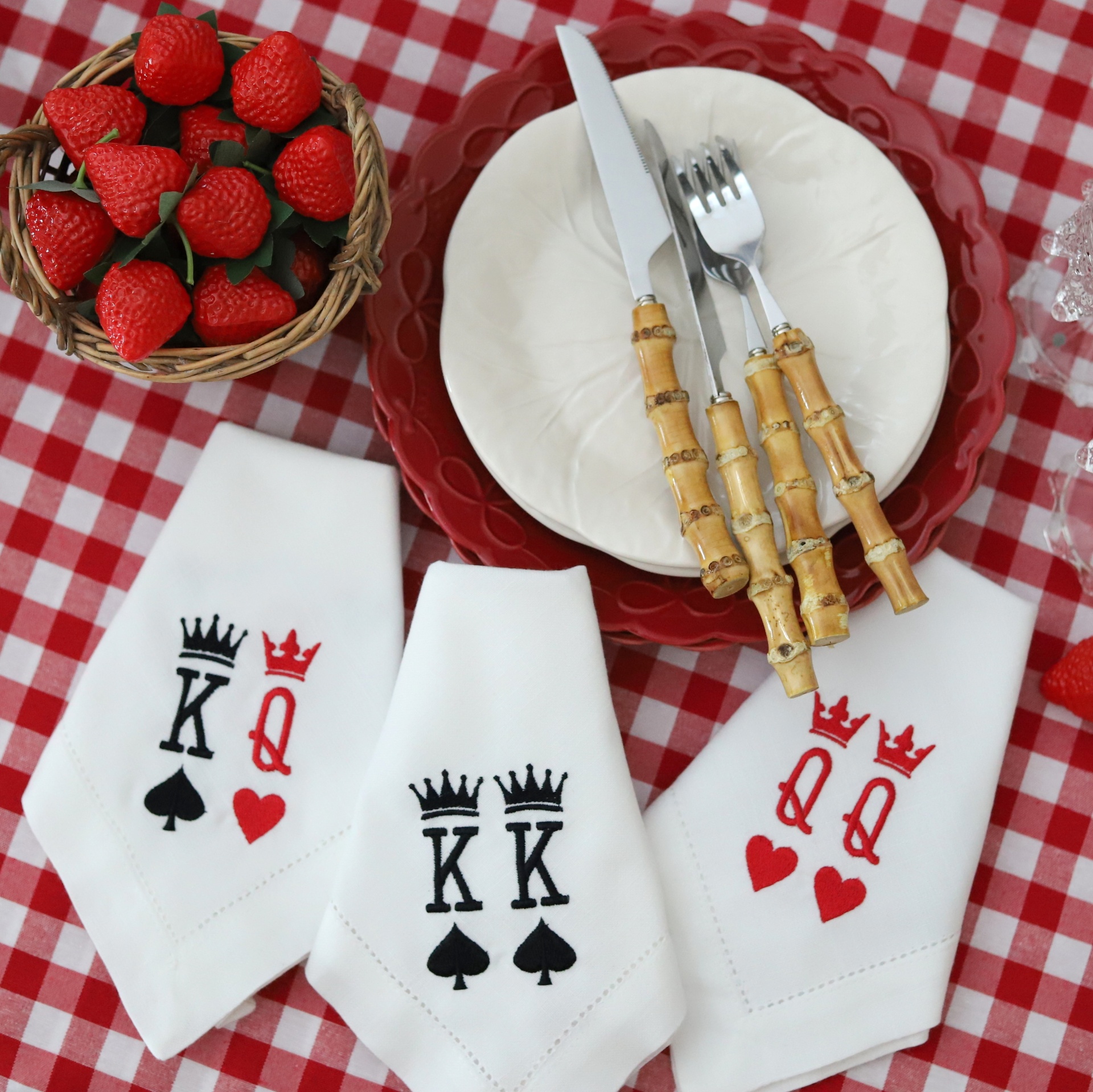 • Guardanapos brancos com bordados de cartas K e Q em preto e vermelho numa mesa com toalha xadrez vermelha e branca
