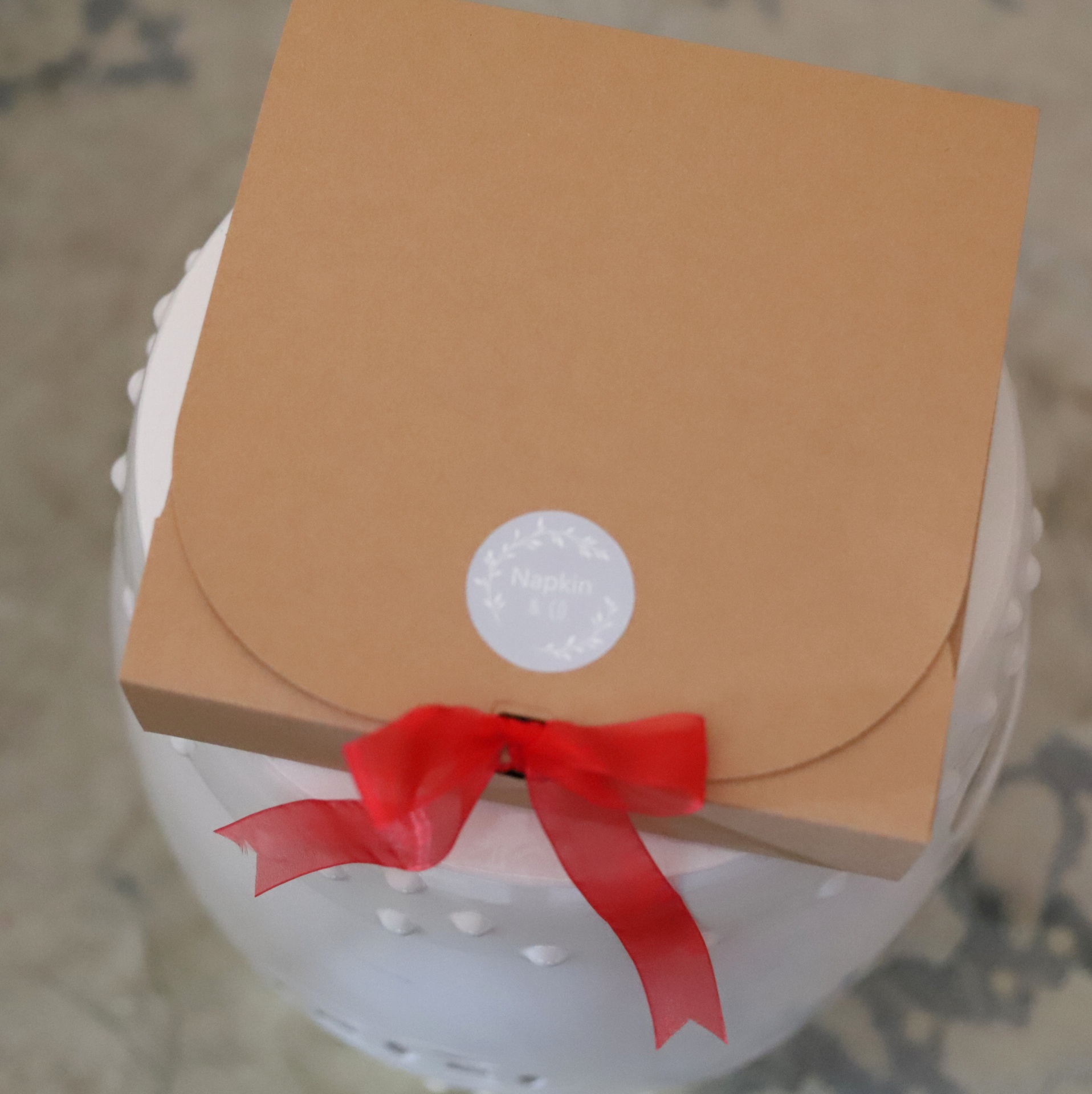 • Caixa castanha com selo branco e laço vermelho em suporte branco decorativo