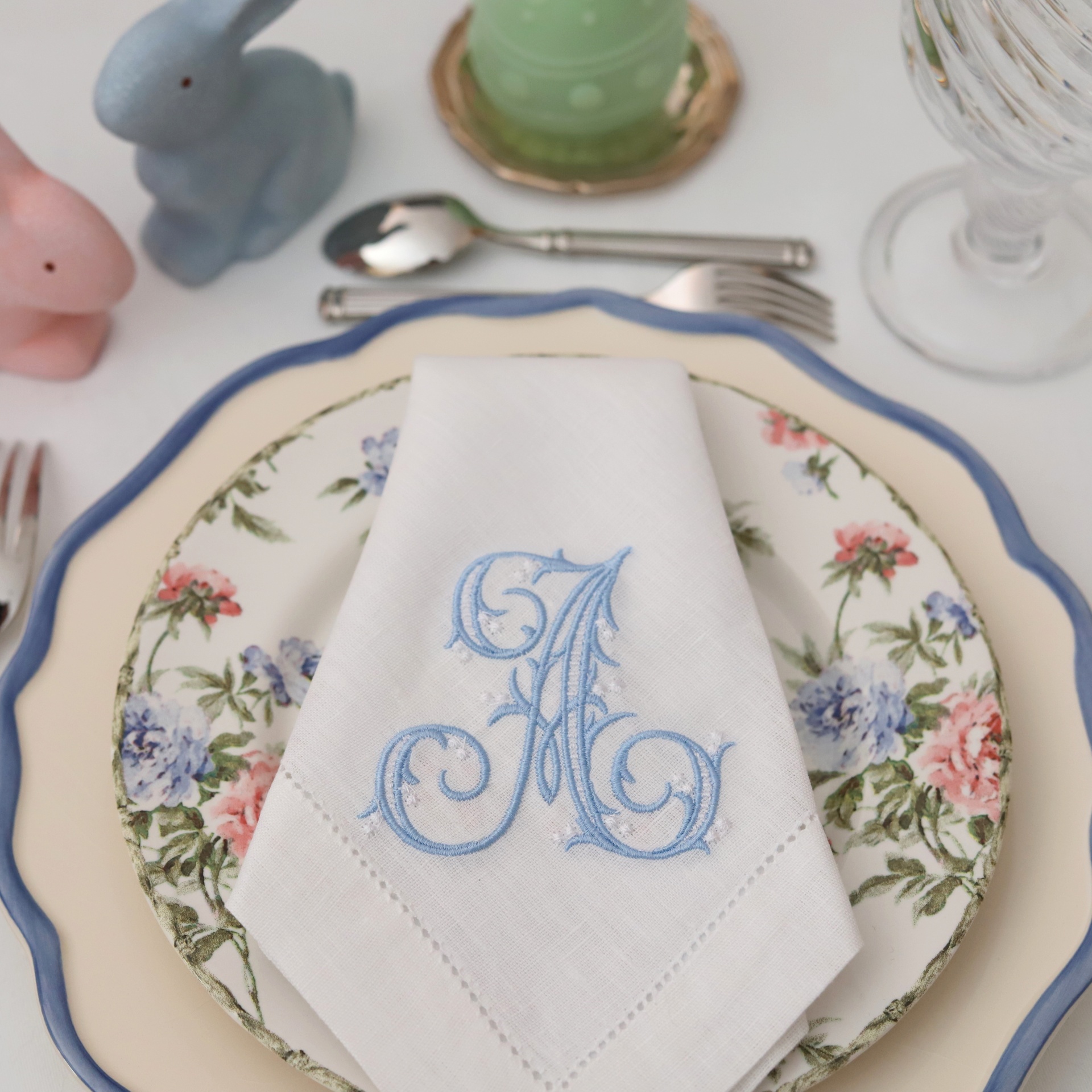 • Mesa posta com pratos florais, guardanapo branco com monograma azul, talheres, copo e coelhos decorativos.