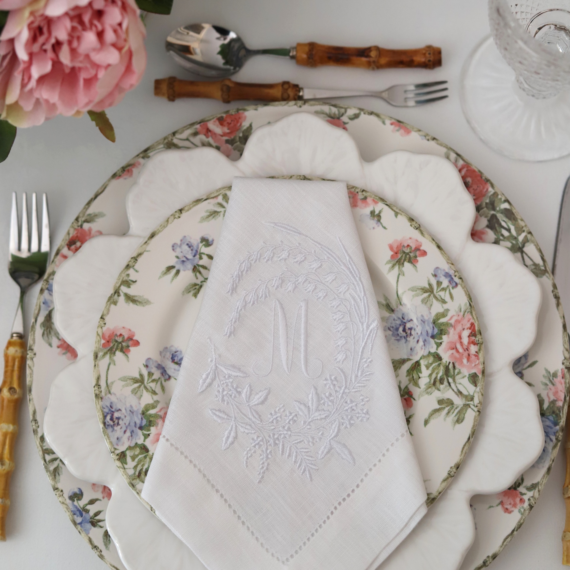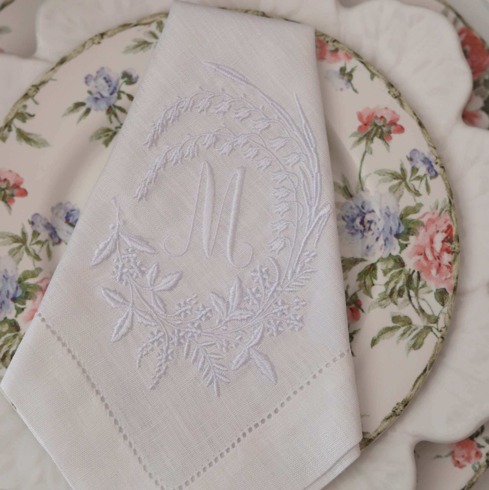 • Guardanapo branco bordado com letra M sobre prato floral de porcelana.