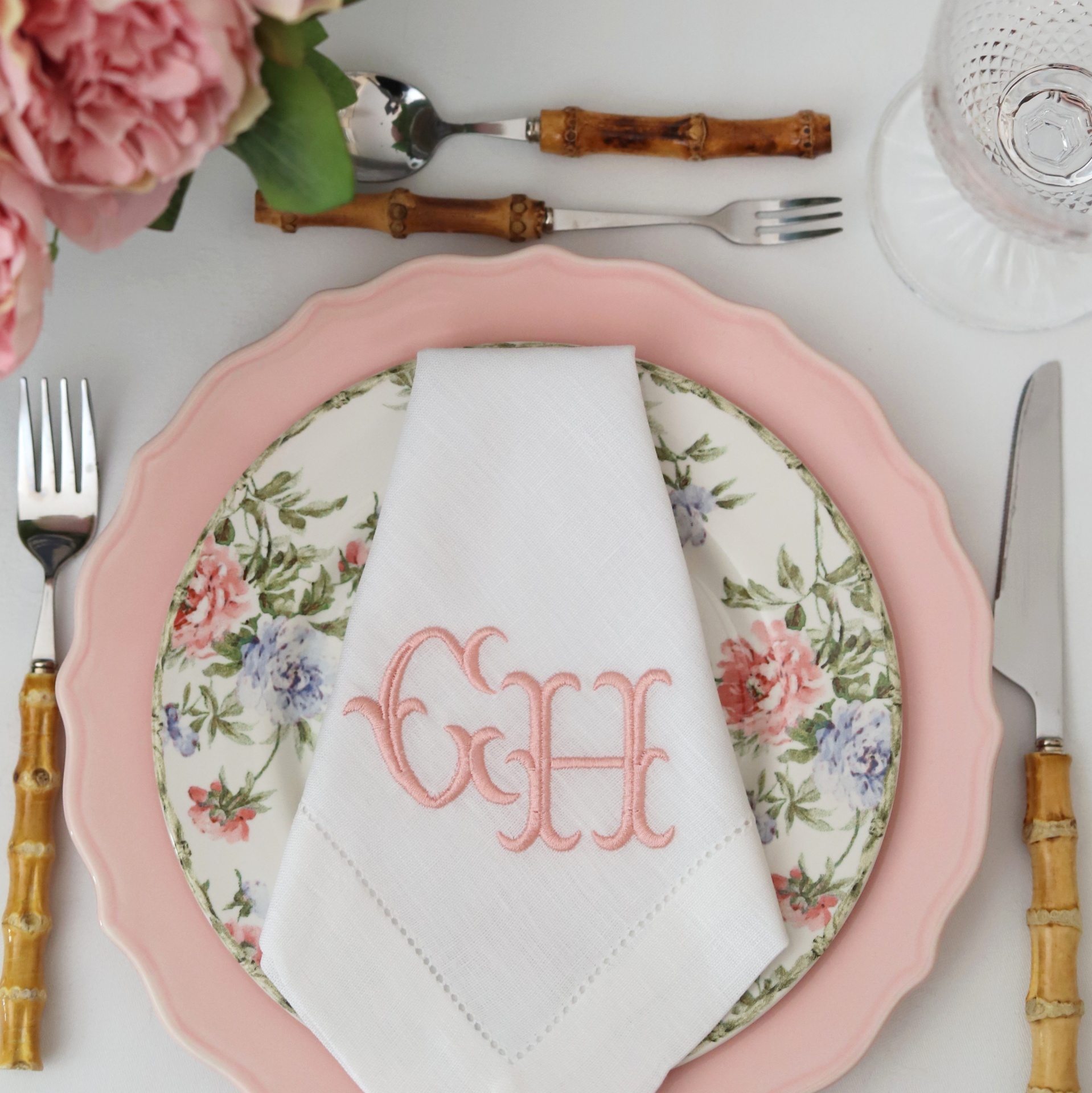 Louça rosa e floral com guardanapo branco bordado GH e talheres com cabo de bambu