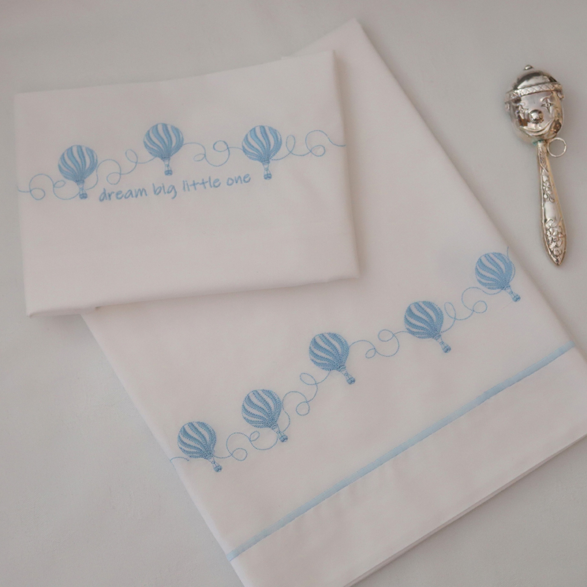 Conjunto de lençol de cima com 75x120cm bordado + 1 lençol de baixo com 75x110cm + 1 fronha de almofada com 25x35cm bordado, em 100% algodão.