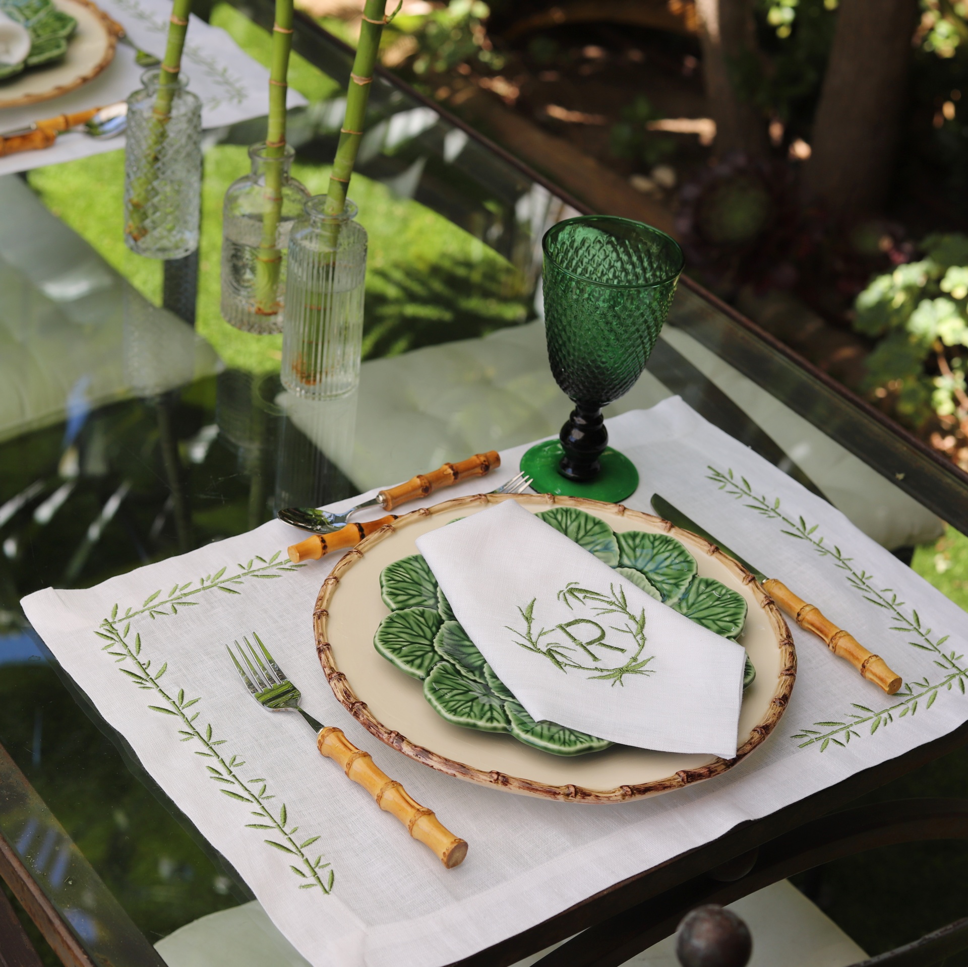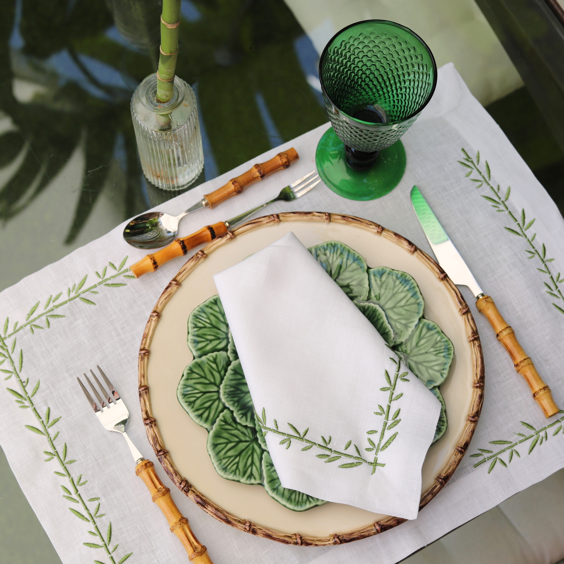 • Mesa posta com pratos creme e verde, talheres com cabo de bambu, guardanapo branco bordado e copo verde.