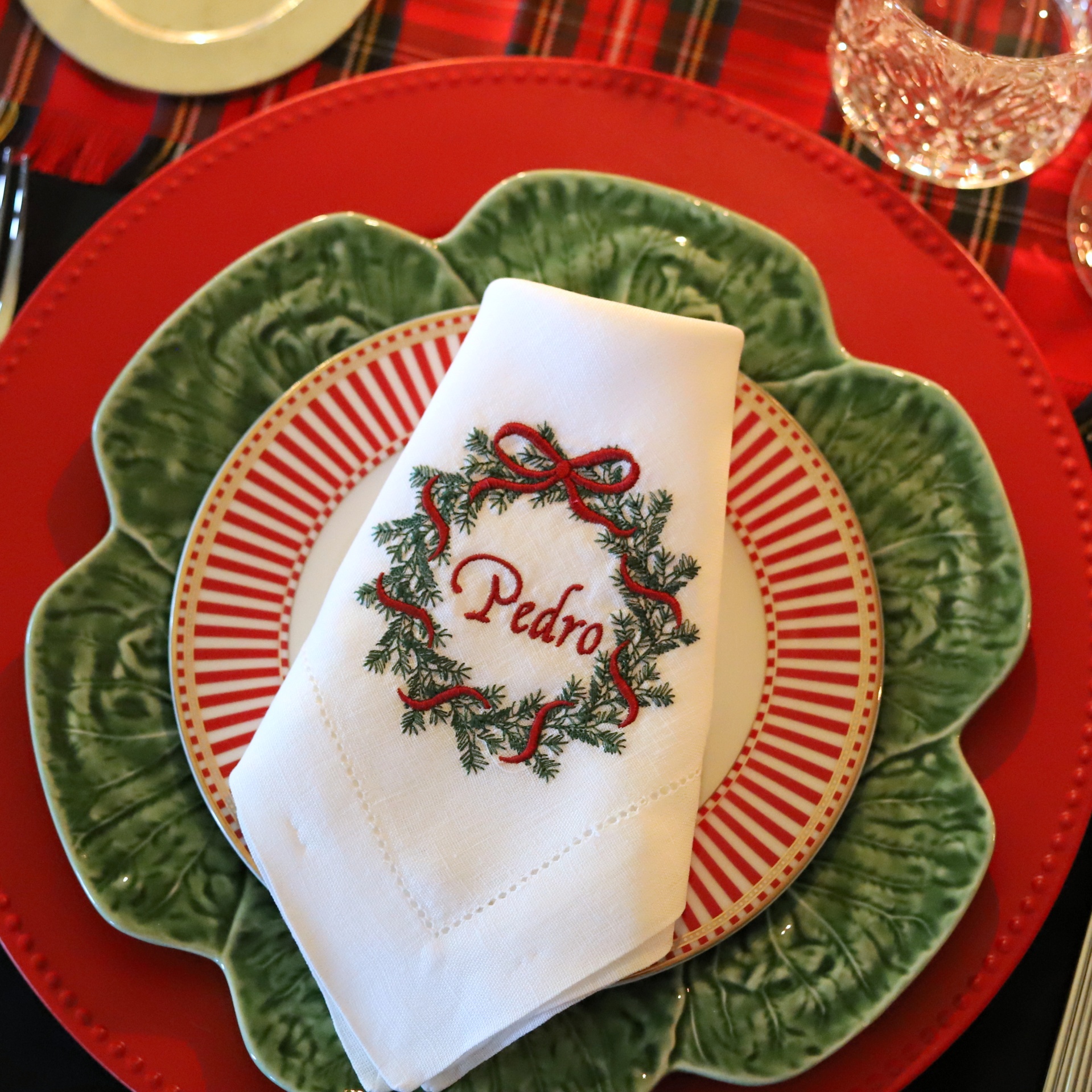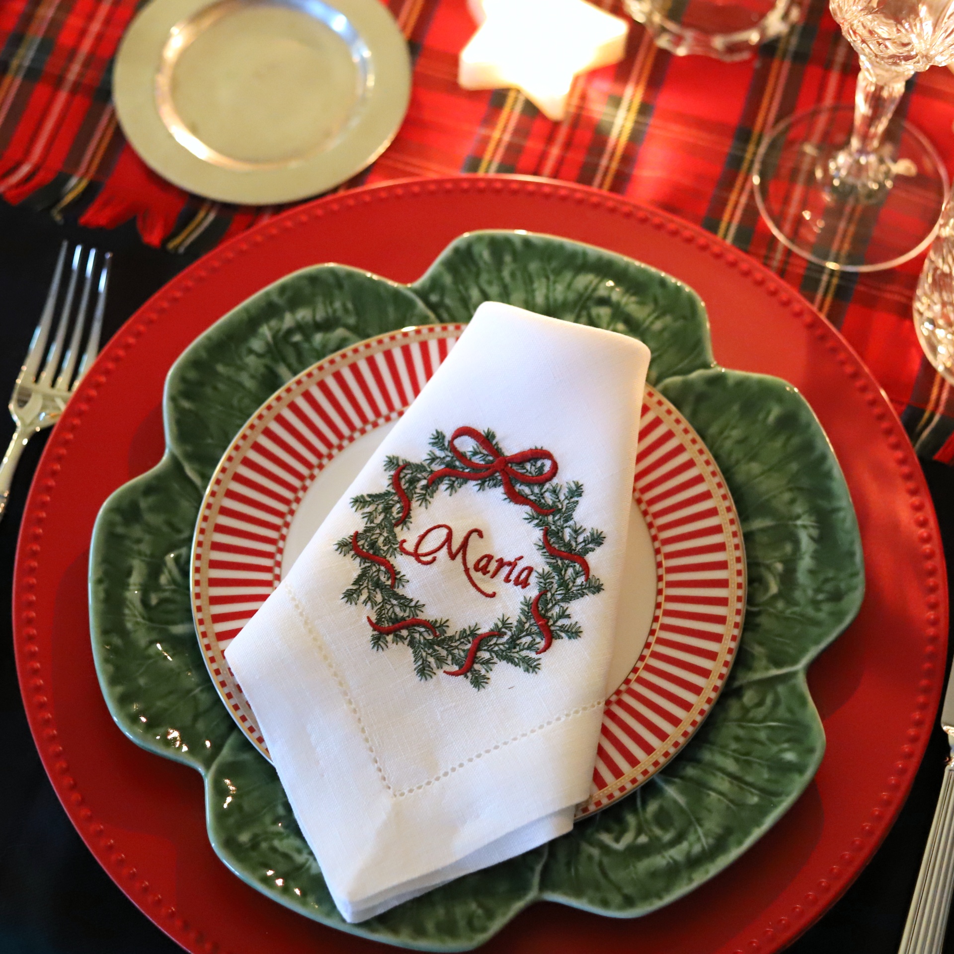 • Conjunto de pratos e guardanapo bordado com nome, com decoração natalícia sobre toalha xadrez.