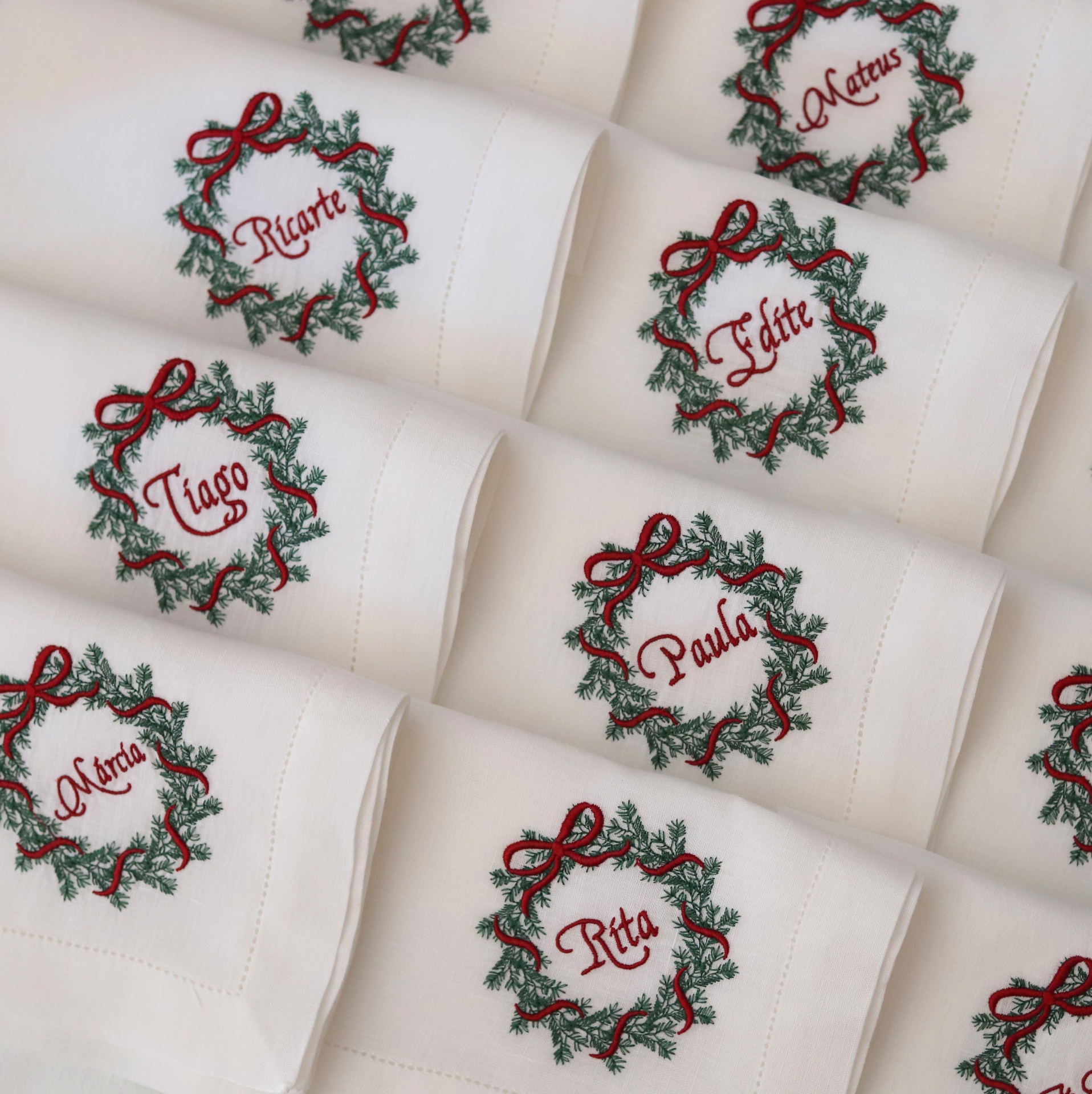 • Guardanapos brancos com bordados de coroas de Natal e nomes em vermelho
