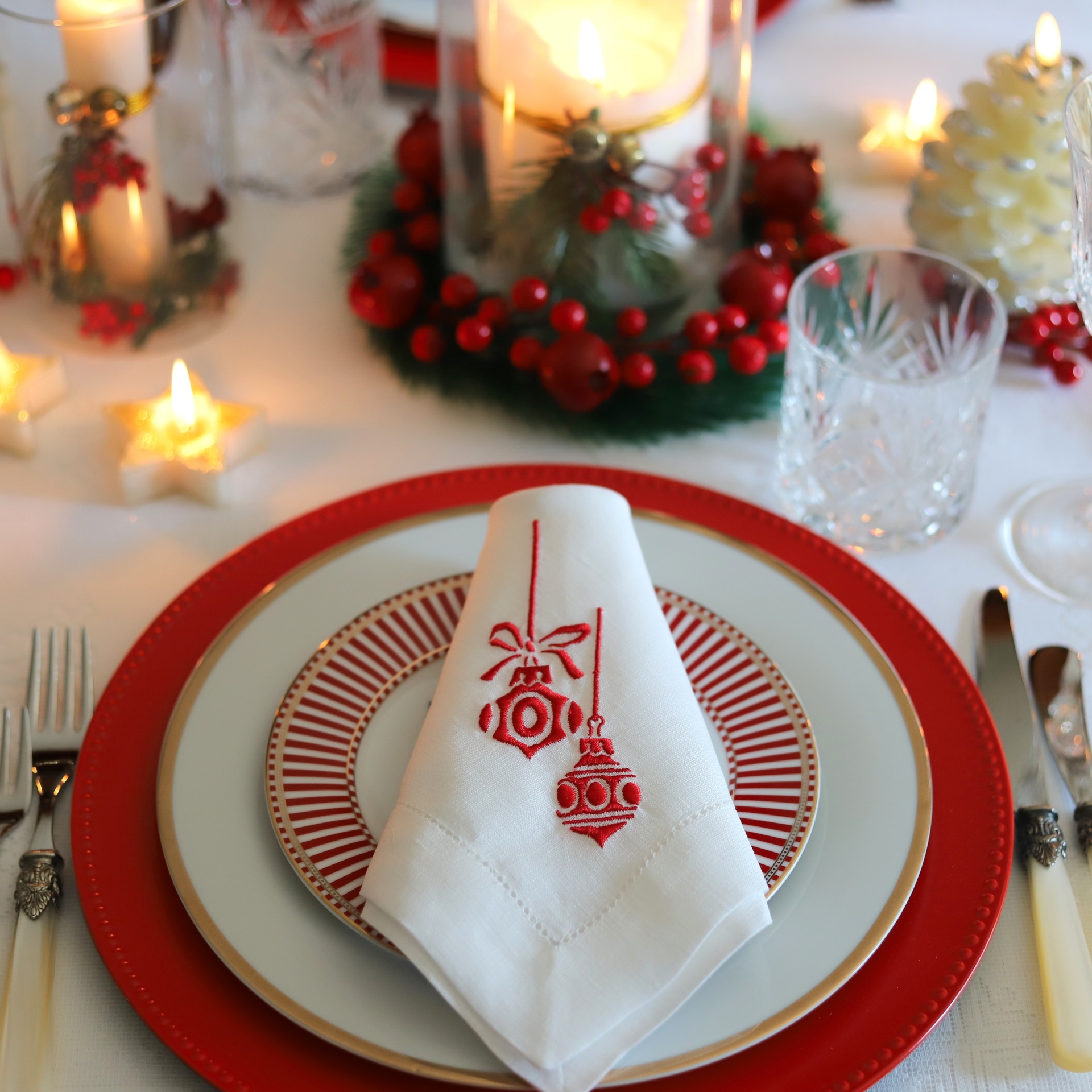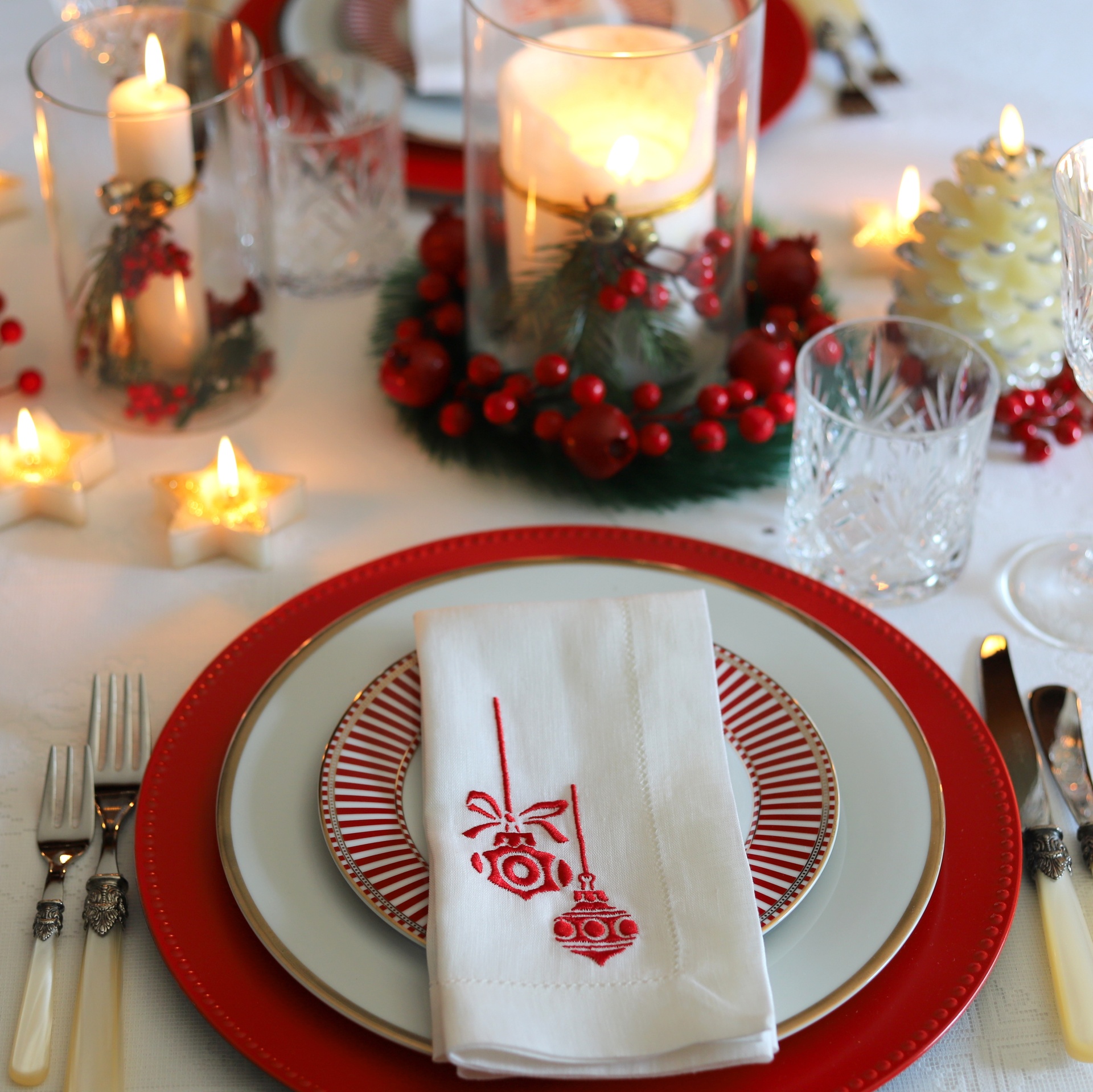 • Mesa posta com pratos decorados, guardanapo bordado com bolas de Natal e velas acesas