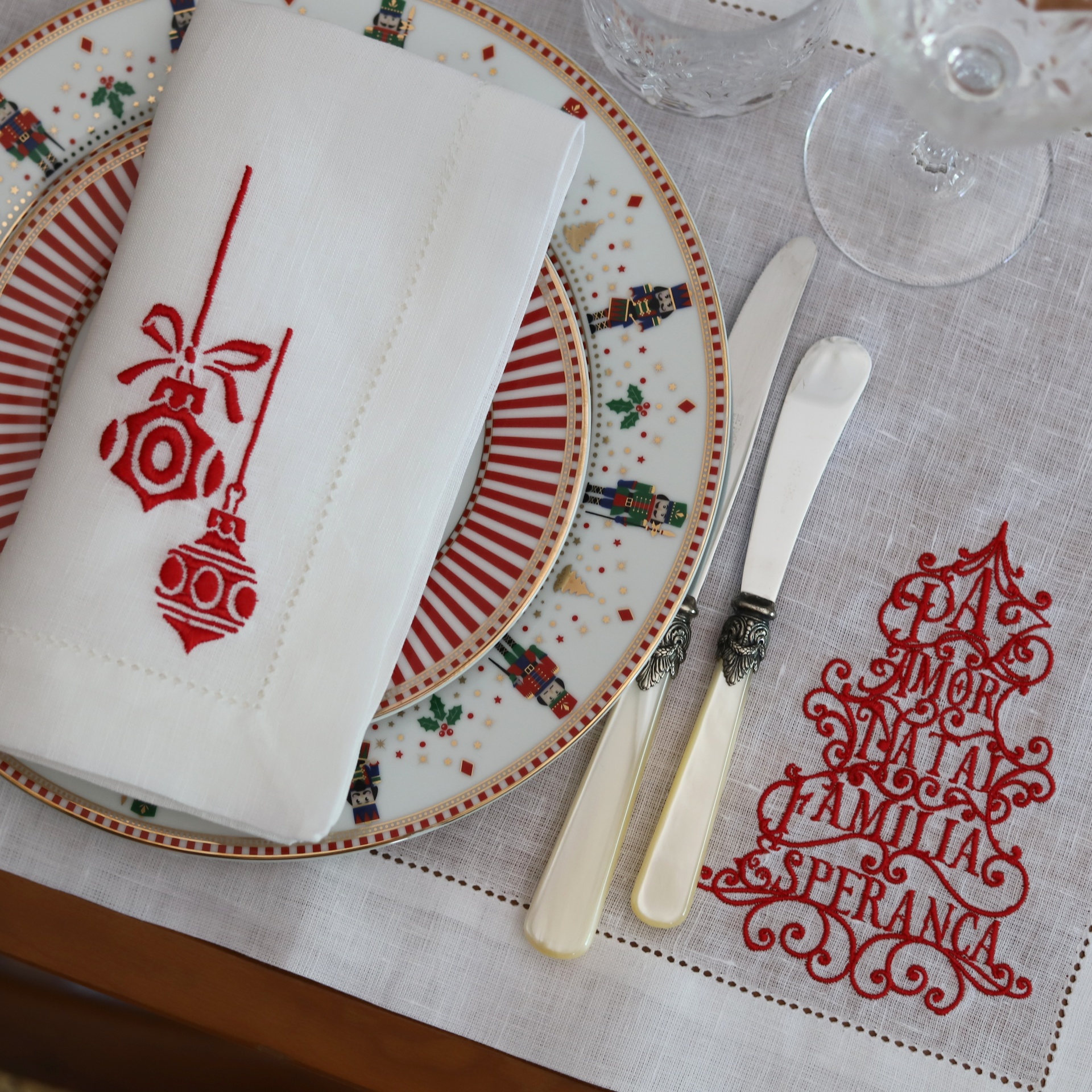 • Guardanapo branco bordado com decoração natalícia vermelho sobre prato natalício e toalha com árvore de Natal bordada e texto
