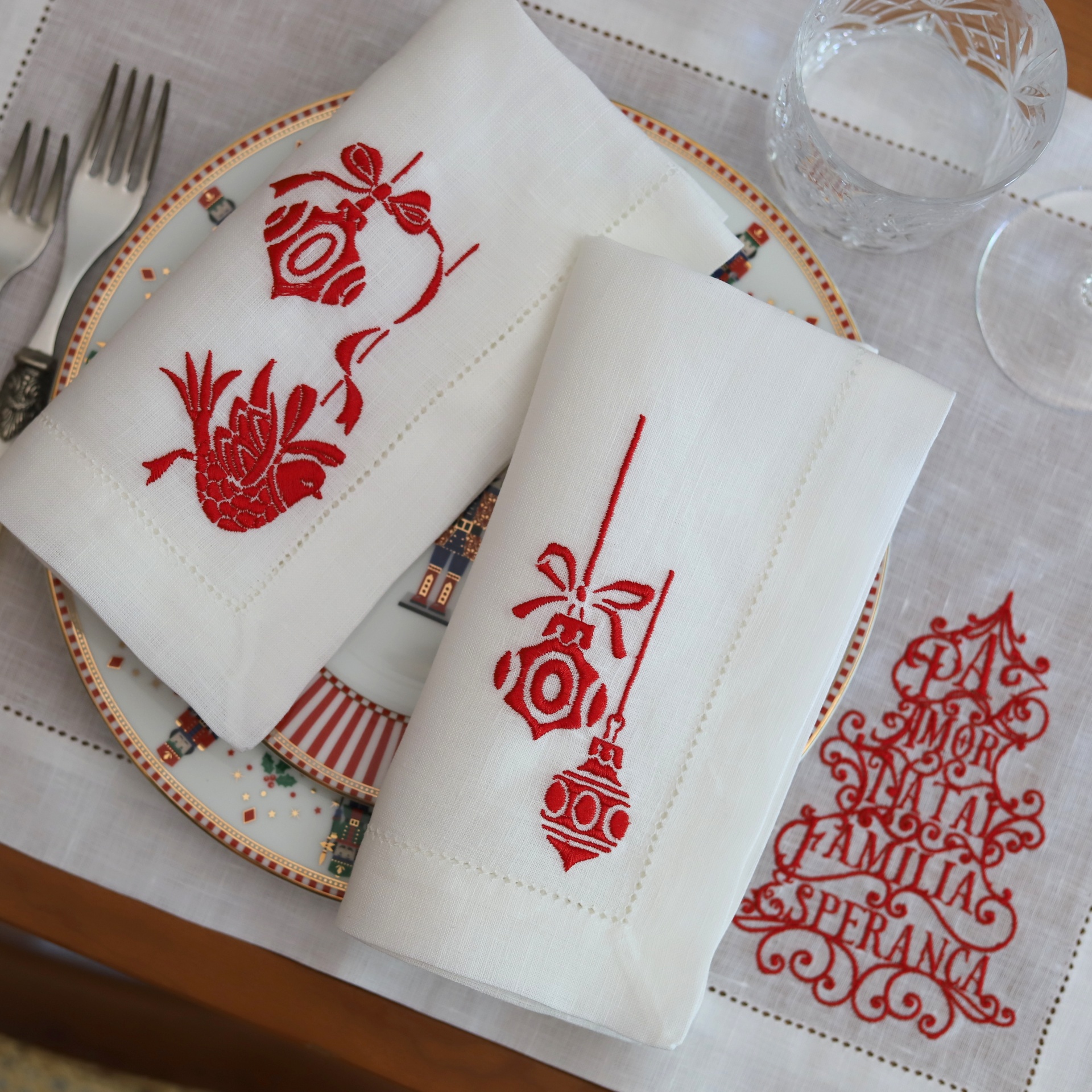 • Guardanapos brancos de tecido com bordados vermelhos natalícios