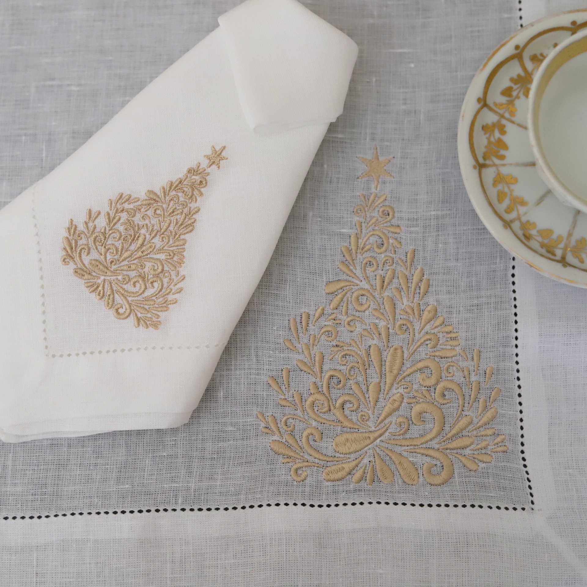 Guardanapo com 45cm X 45cm, em linho branco e bainha de 3 cm em ponto ajour