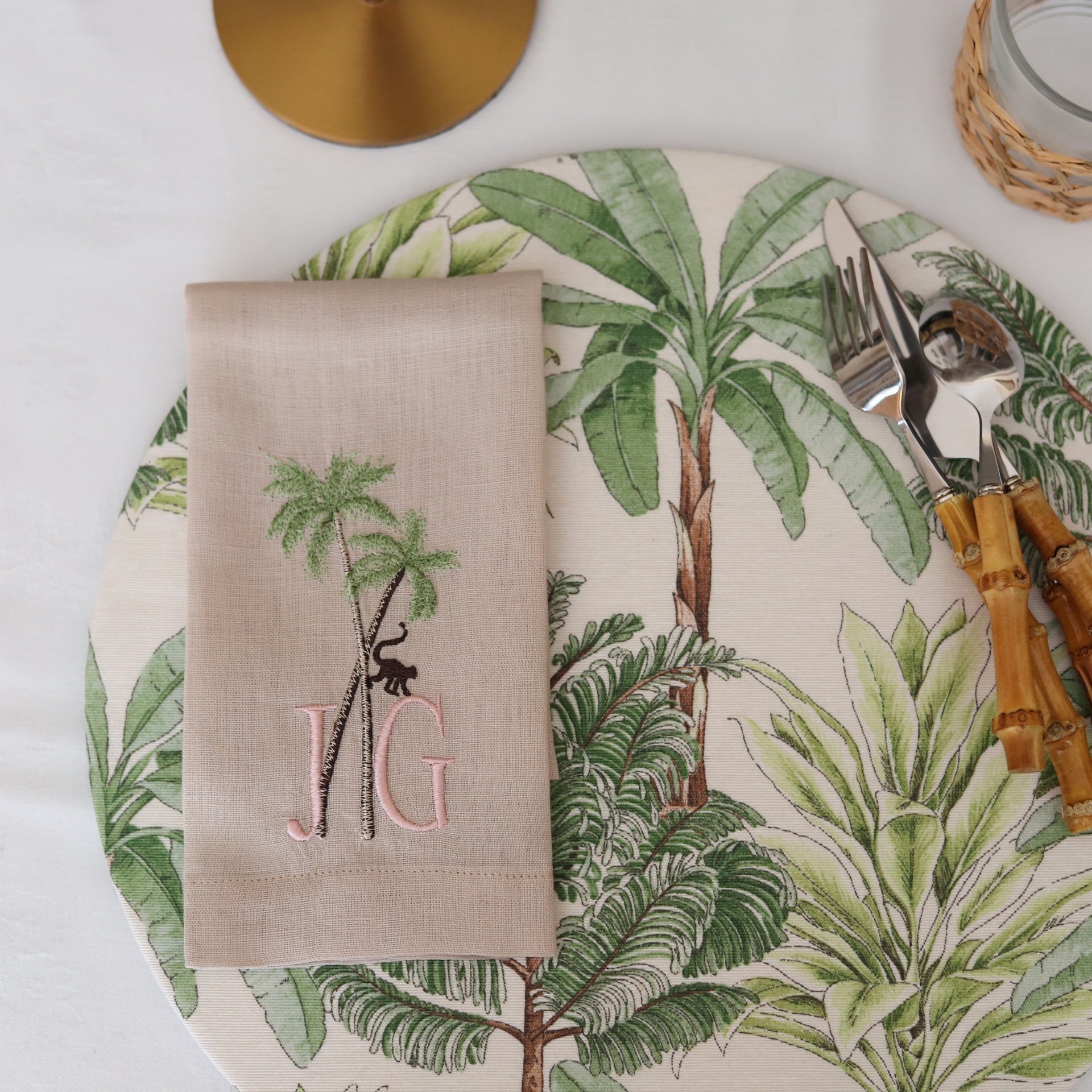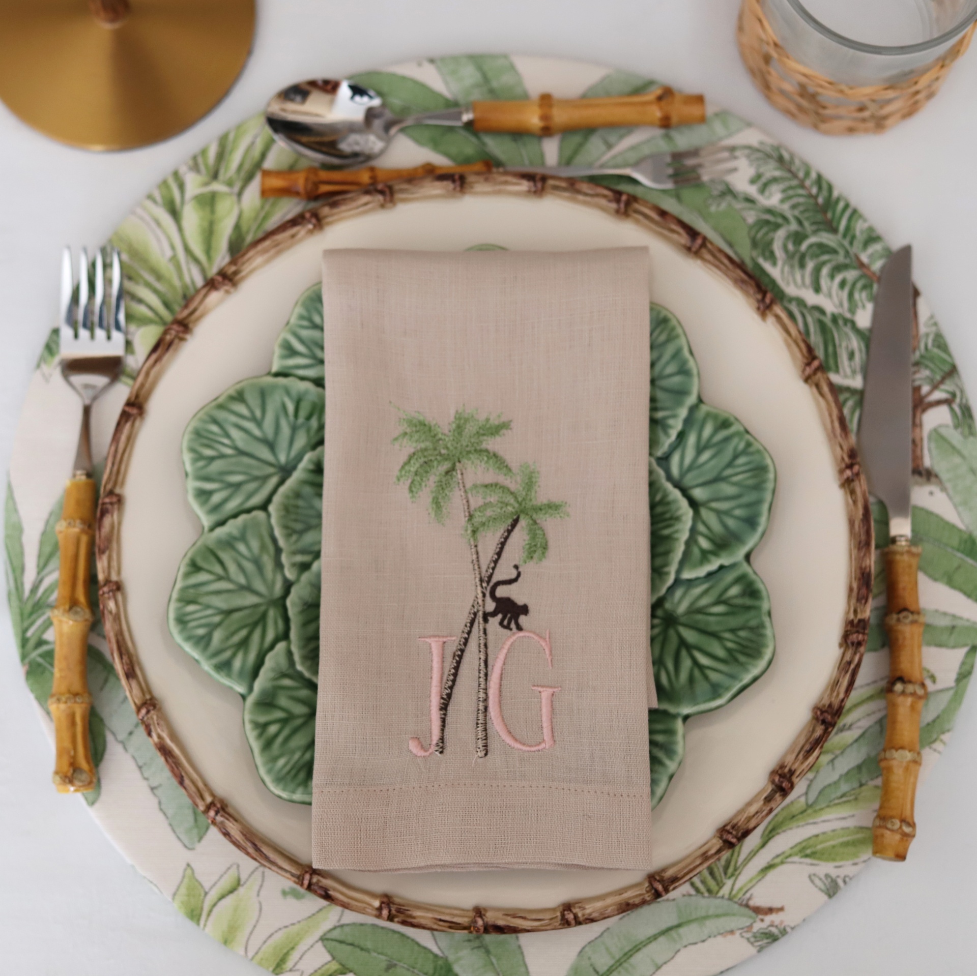 Guardanapo bege bordado com palmeiras e monograma JG sobre prato com padrão de folhas verdes e talheres com cabos em madeira