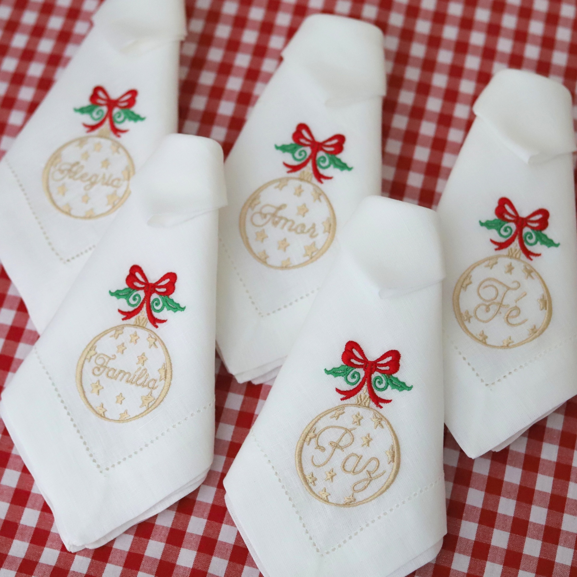 Guardanapos brancos com bordados natalícios coloridos sobre toalha xadrez vermelha e branca