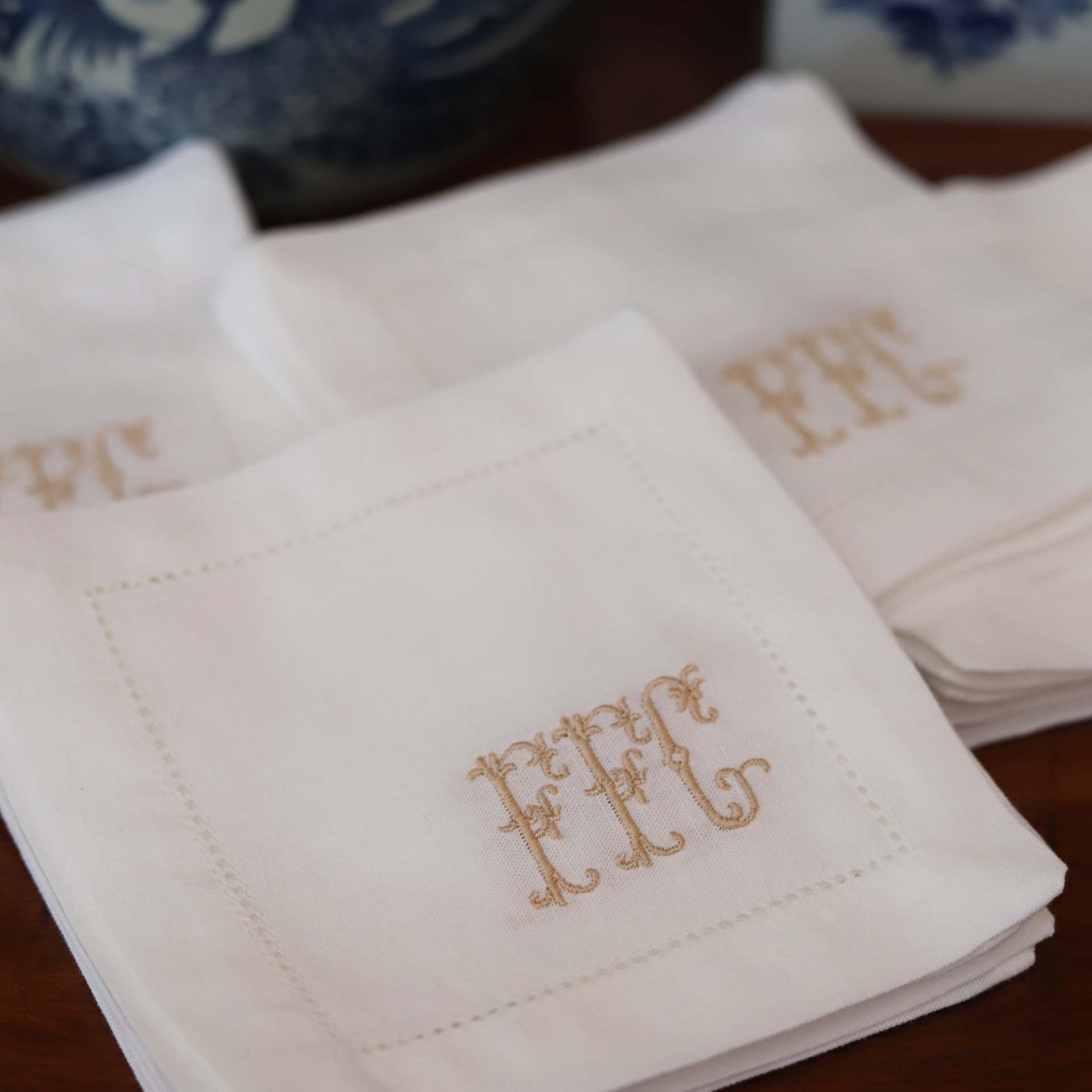 • Guardanapos brancos com monograma dourado FFC e cerâmica azul e branca ao fundo