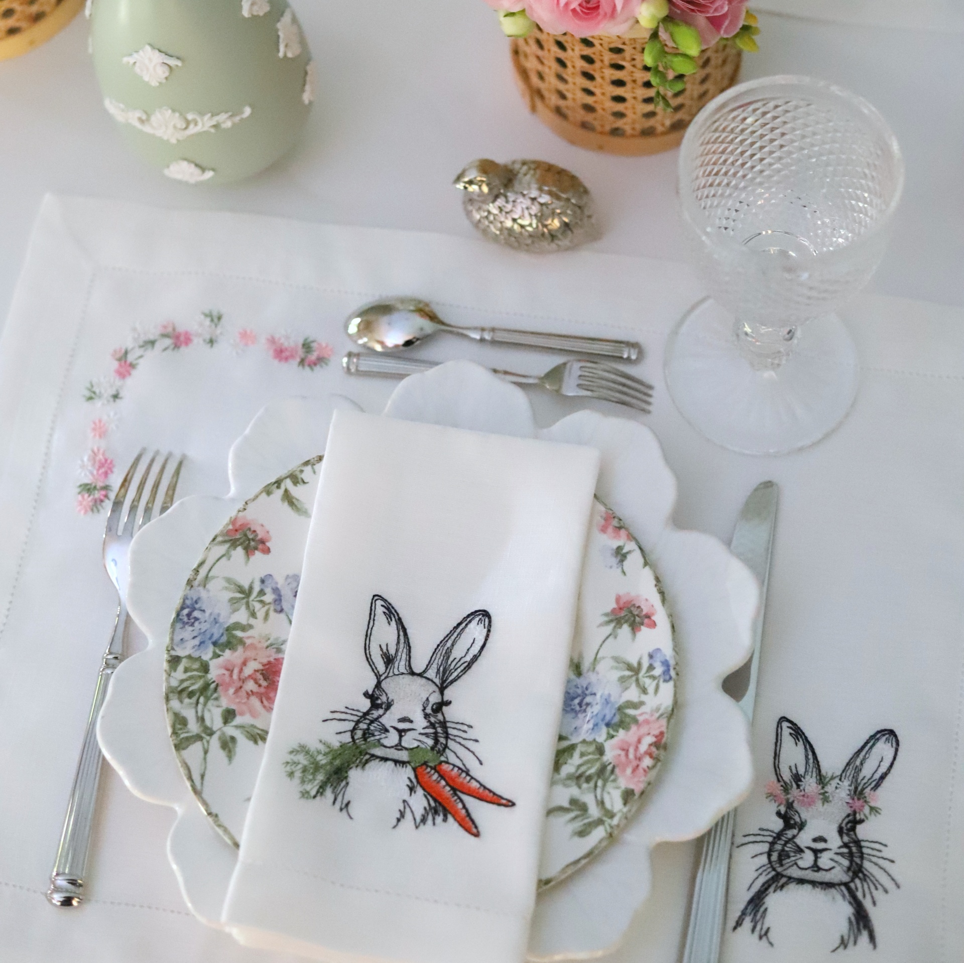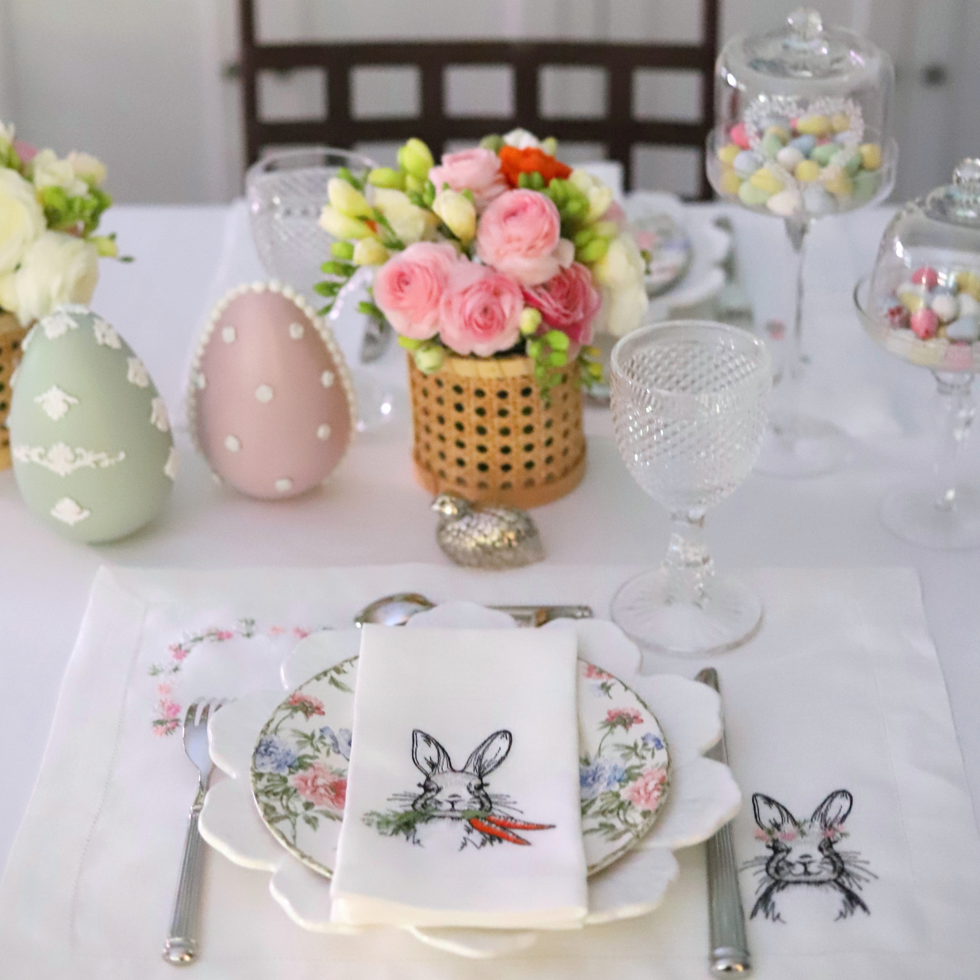 • Mesa posta com louça floral, guardanapo bordado com coelho e talheres prateados e copo de vidro com flores cor de rosa em vaso.