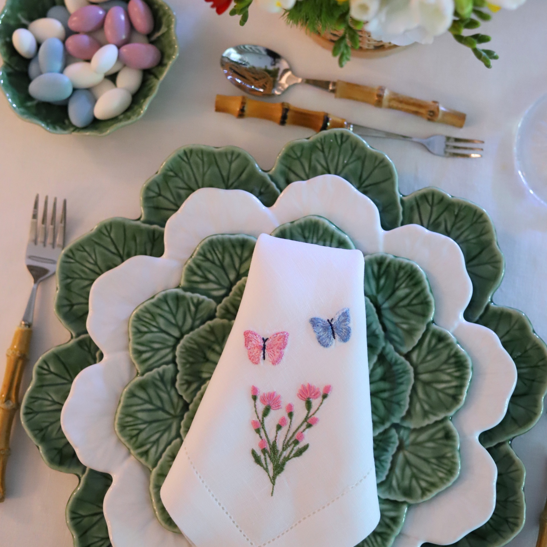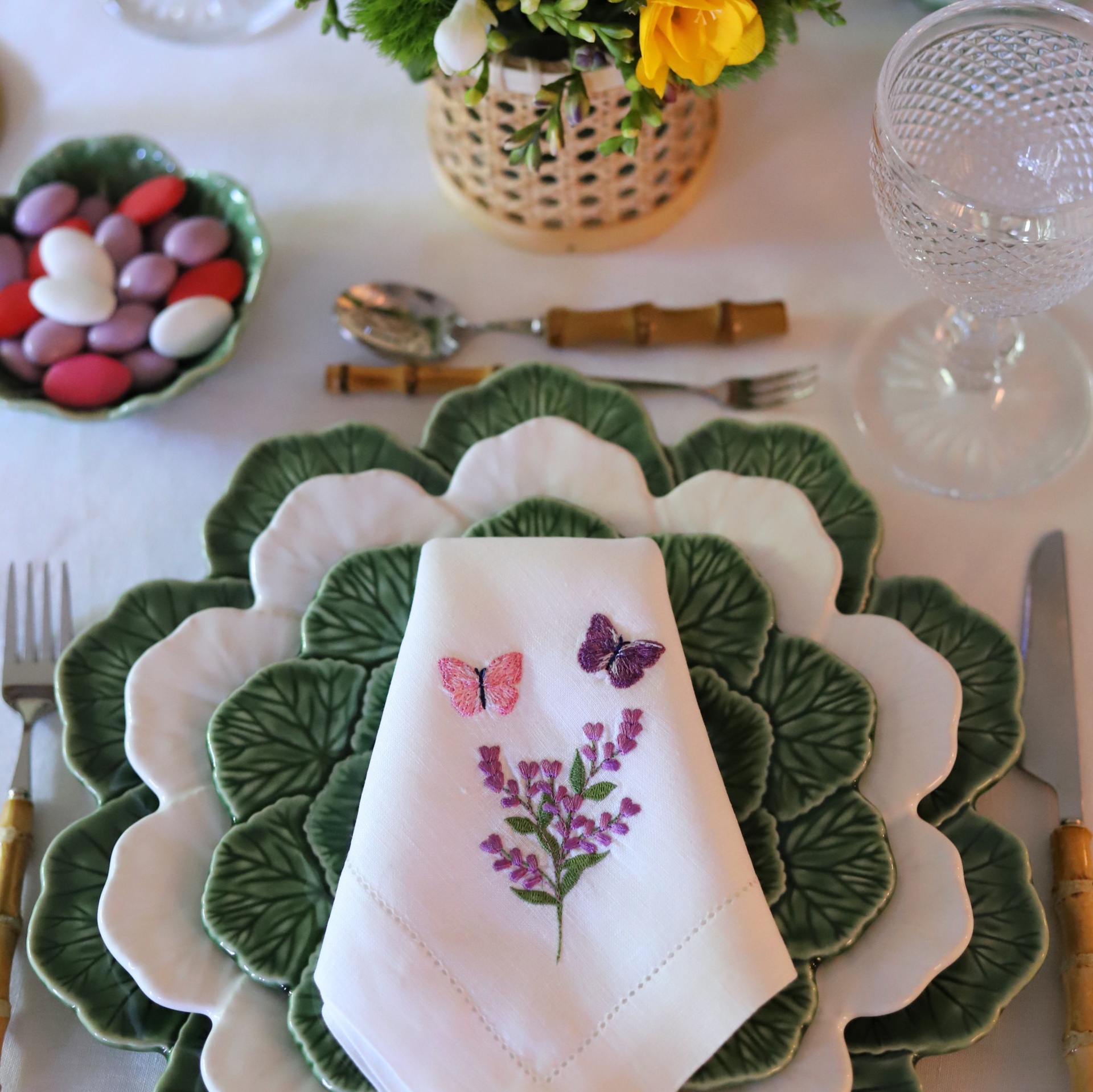 • Pratos em forma de folhas verdes e brancas, guardanapo bordado, talheres com cabo de bambu, doce colorido em prato verde