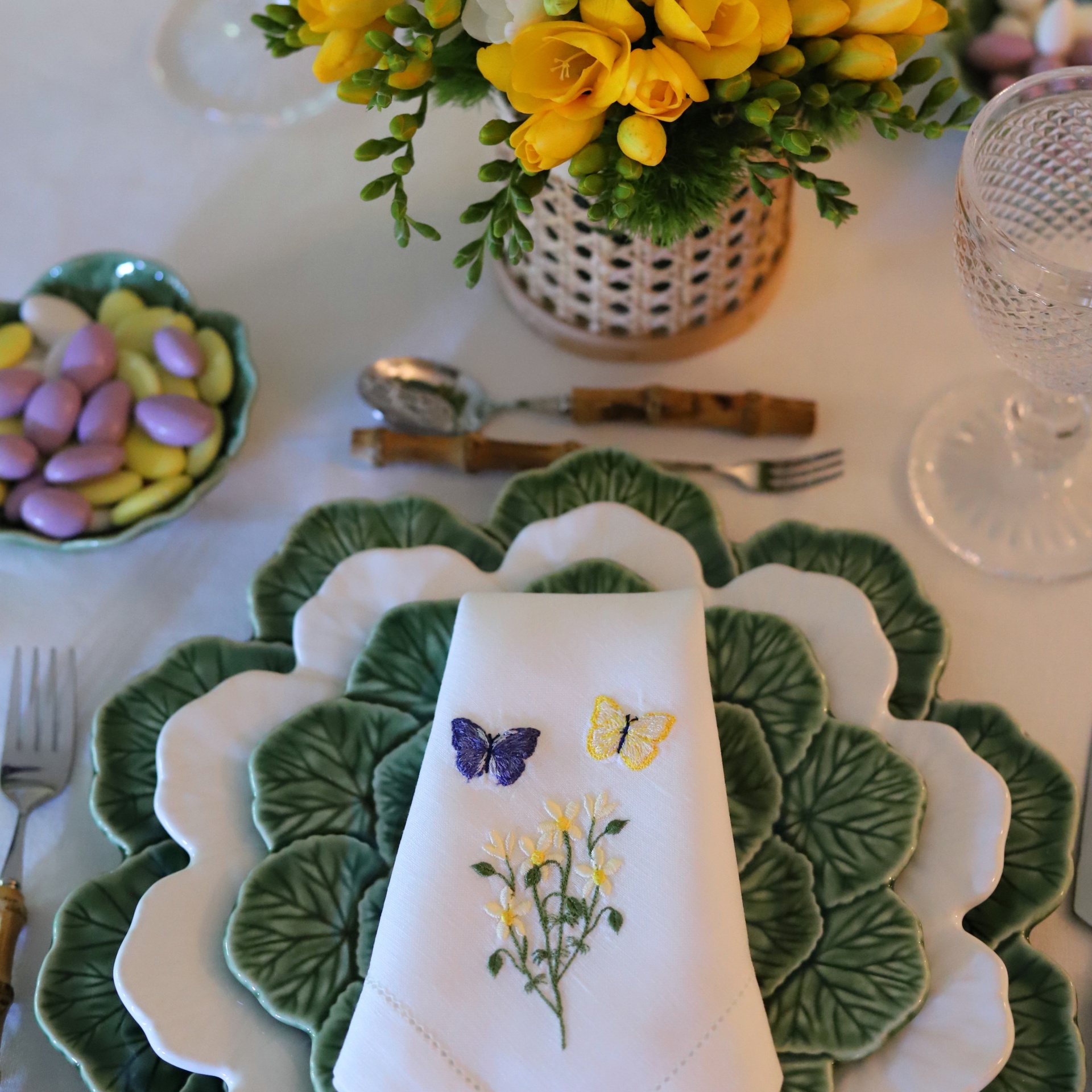 • Conjunto de pratos com padrão folhas, guardanapo bordado com borboletas, talheres de madeira, taça de vidro e arranjo flores amarelas.