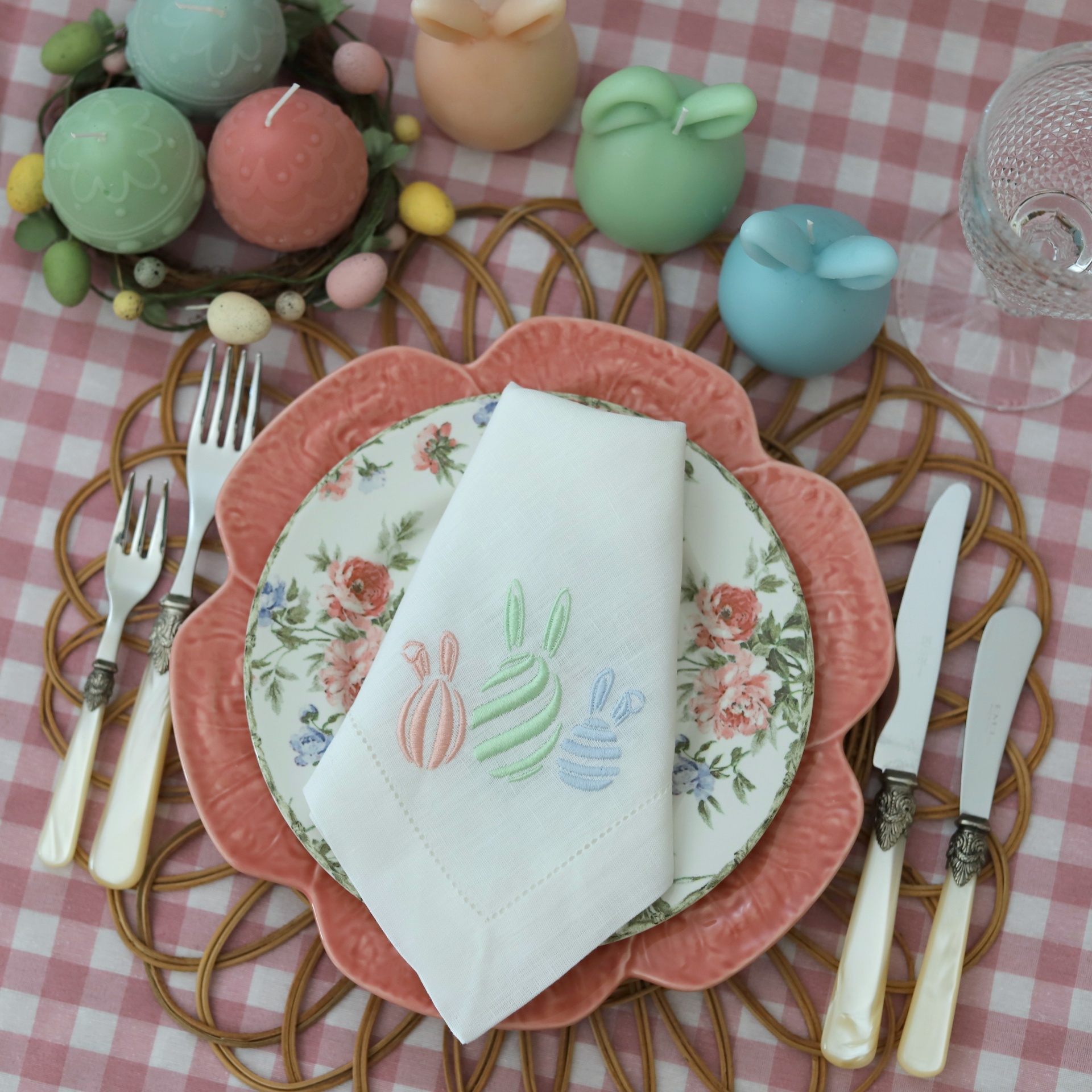 • Mesa posta com guardanapo branco bordado com coelhos, pratos florais e rosas, talheres perlados, velas temáticas de Páscoa e toalha xadrez rosa.