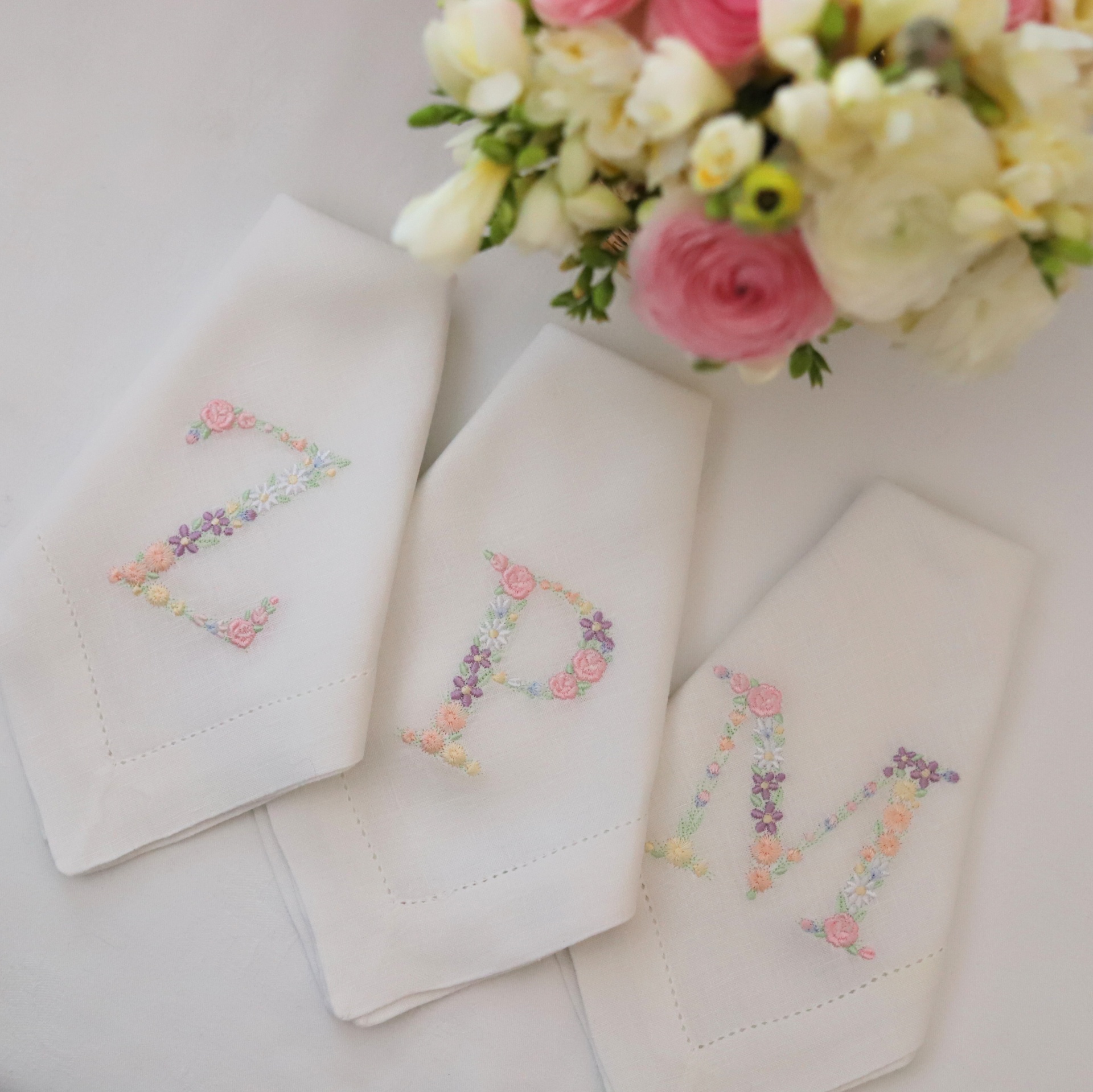 Guardanapos brancos com letras bordadas coloridas e arranjo floral
