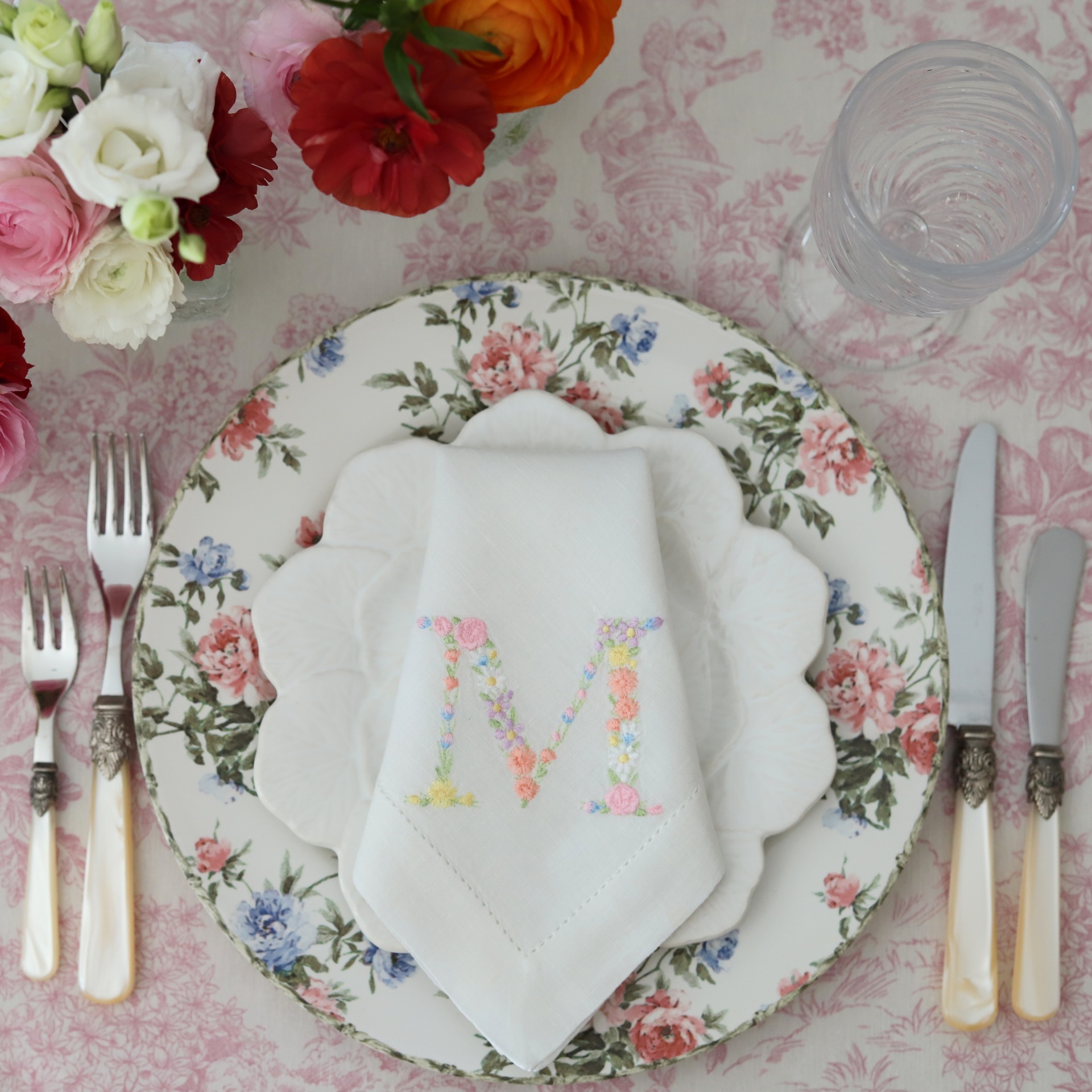 • Mesa posta com prato floral, guardanapo branco com letra M bordada e talheres com cabo creme