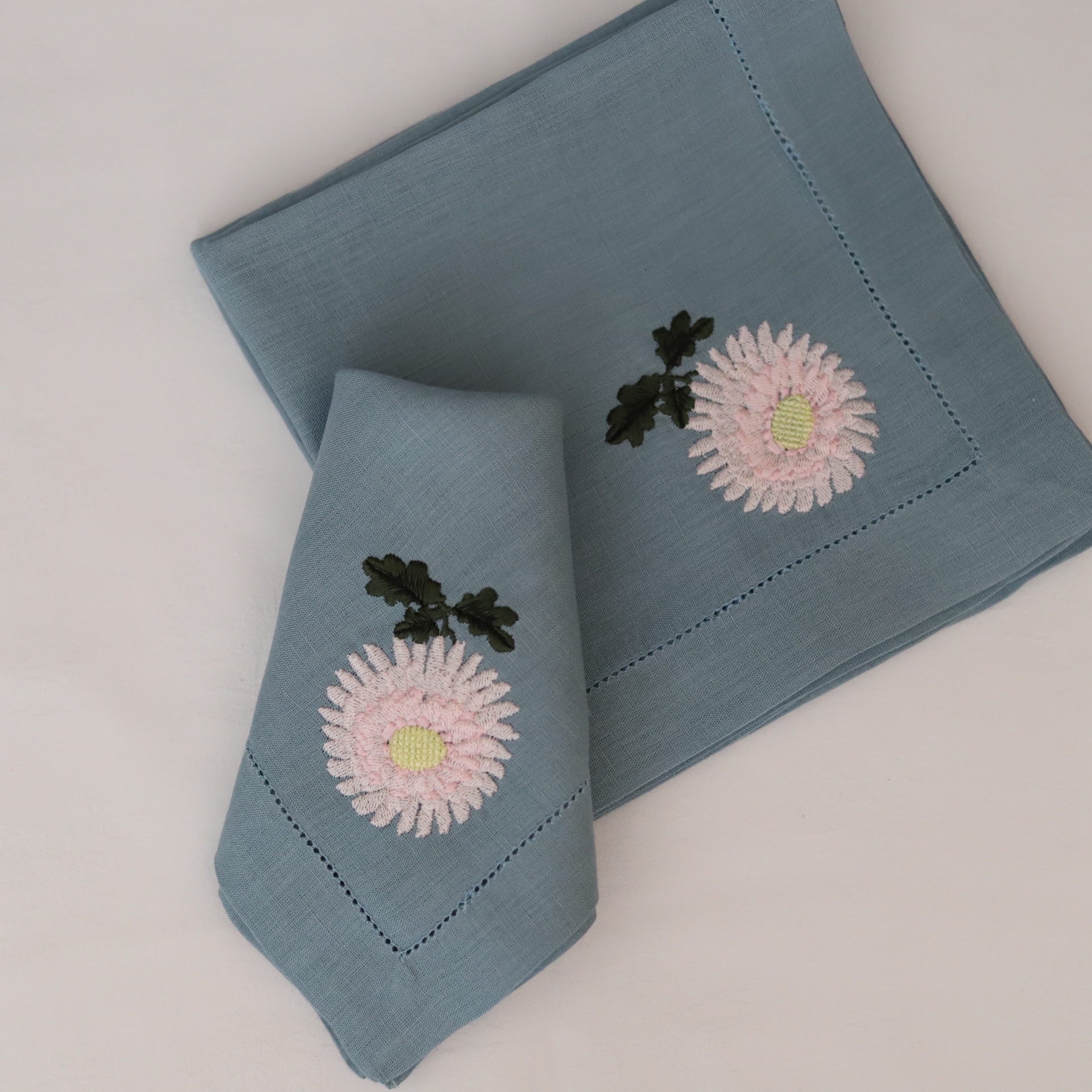 • Guardanapos azuis com bordado de flores cor-de-rosa e verde
