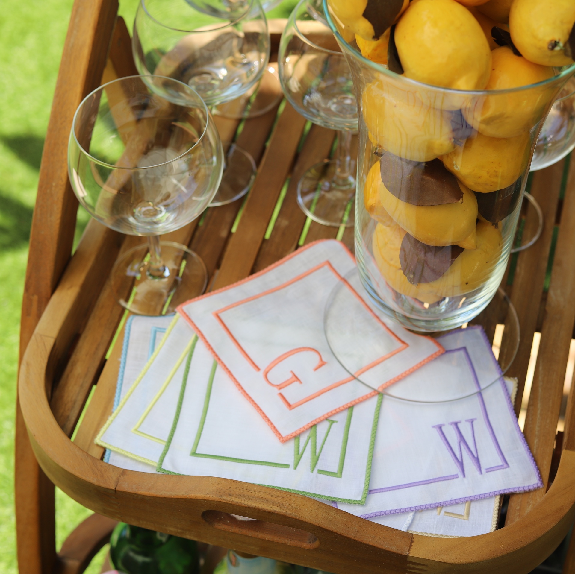 • Carrinho de madeira com copos de vidro, guardanapos bordados e jarra com limões amarelos.