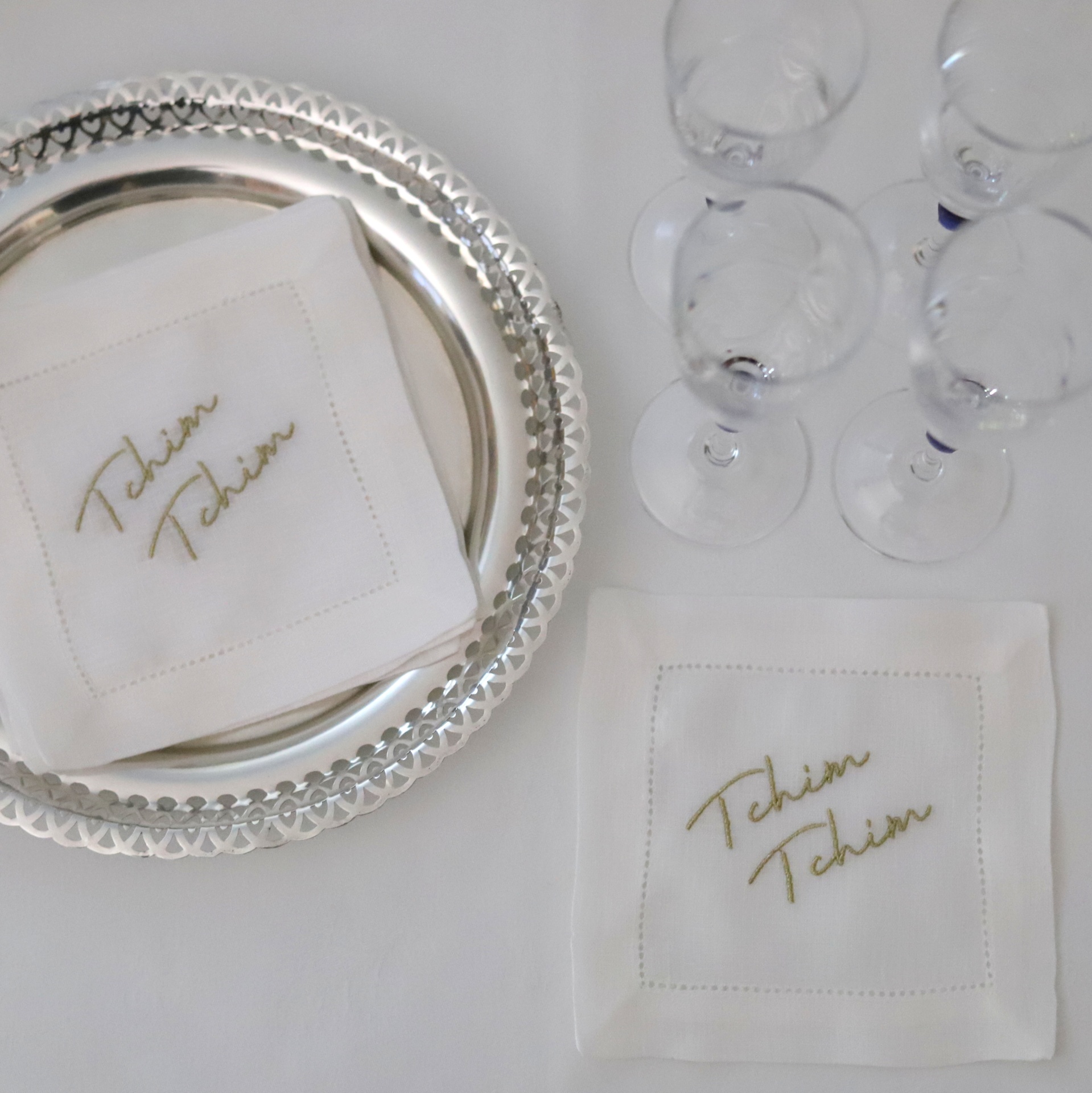 • Guardanapos brancos com bordado dourado Tchim Tchim, pratos prateados e copos de vidro numa mesa branca