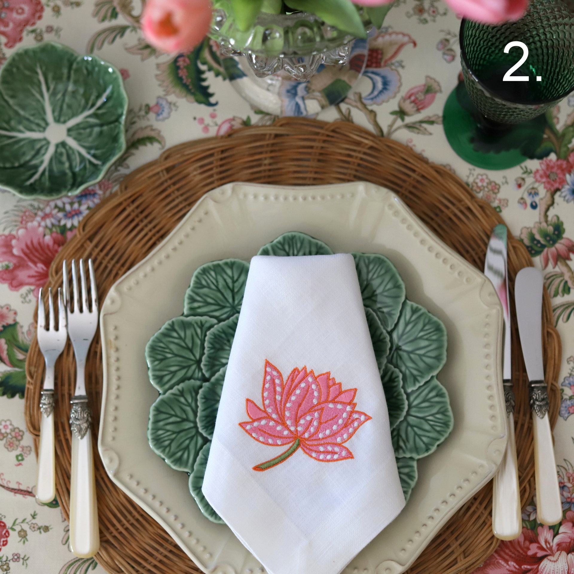 • Mesa posta com pratos cerâmicos creme e verdes, guardanapo branco bordado e talheres variados sobre toalha floral.