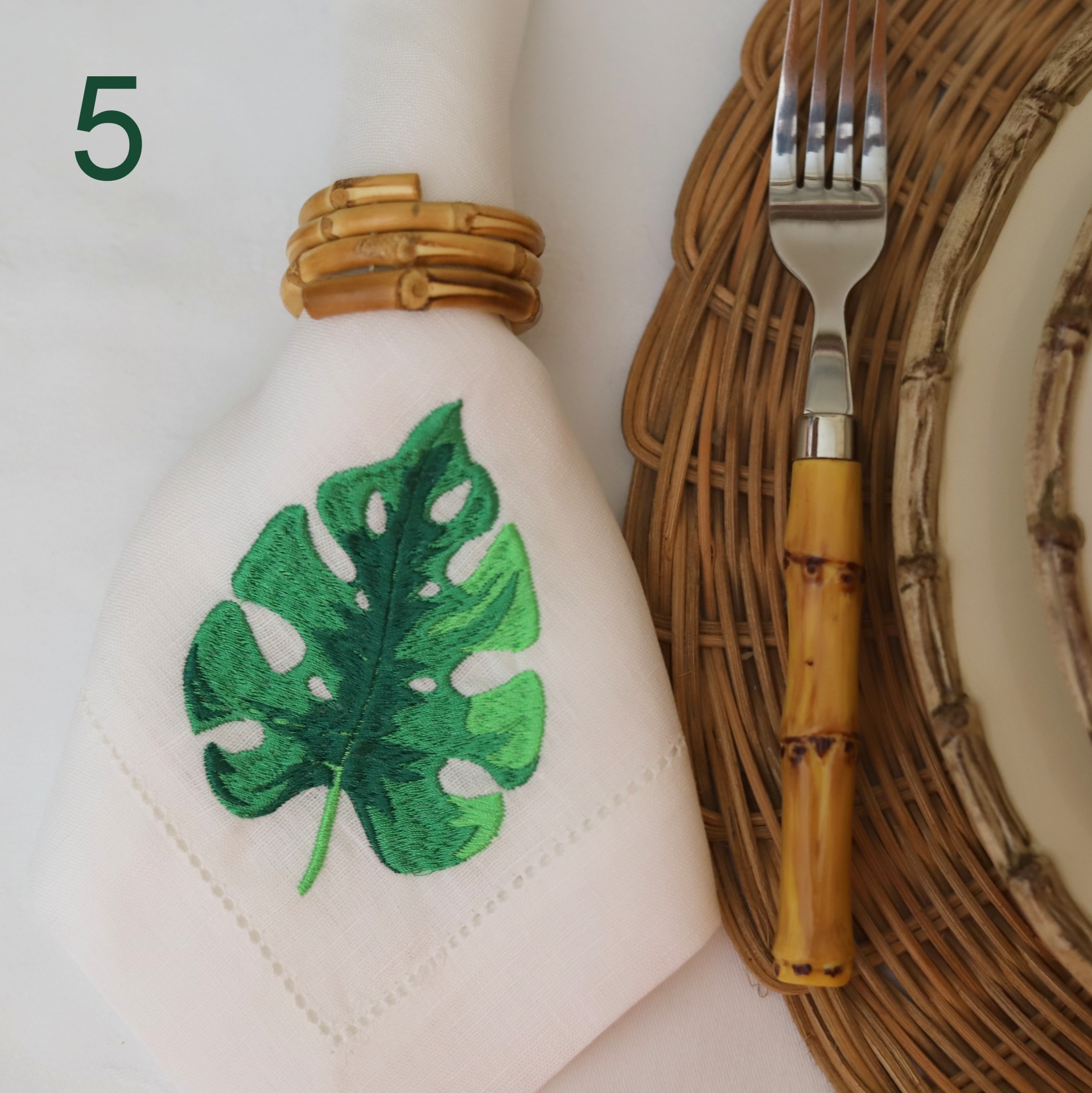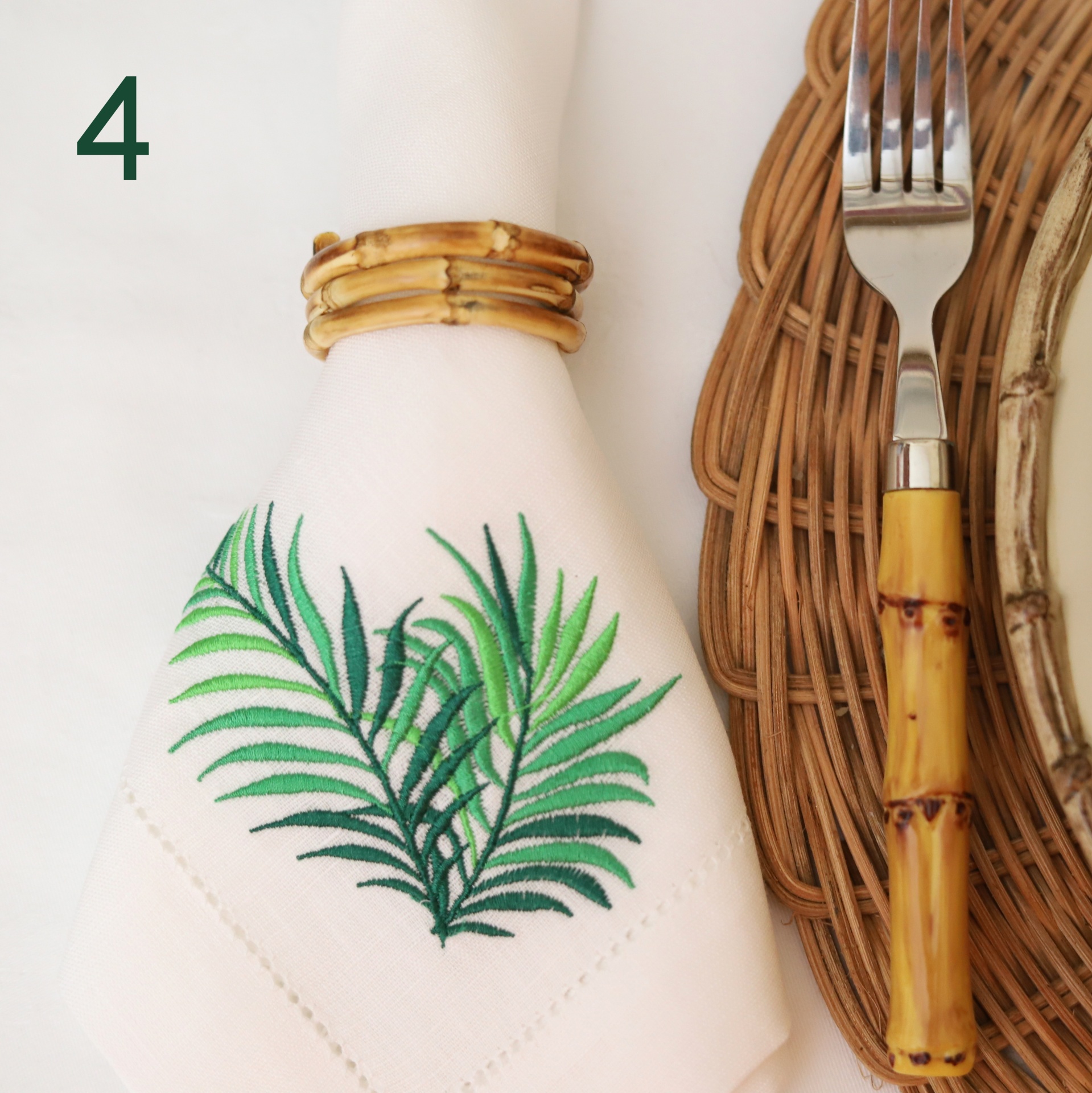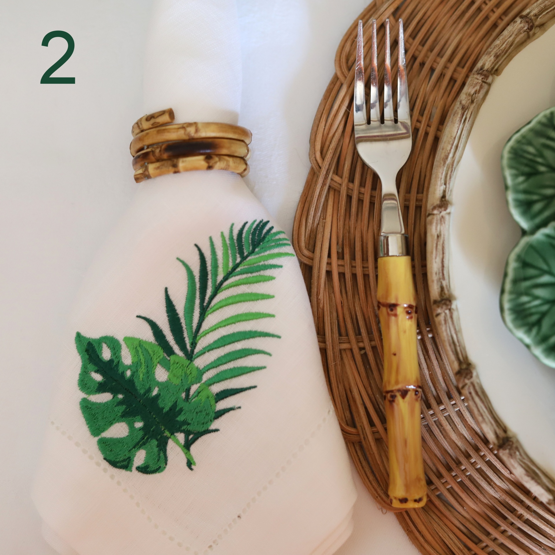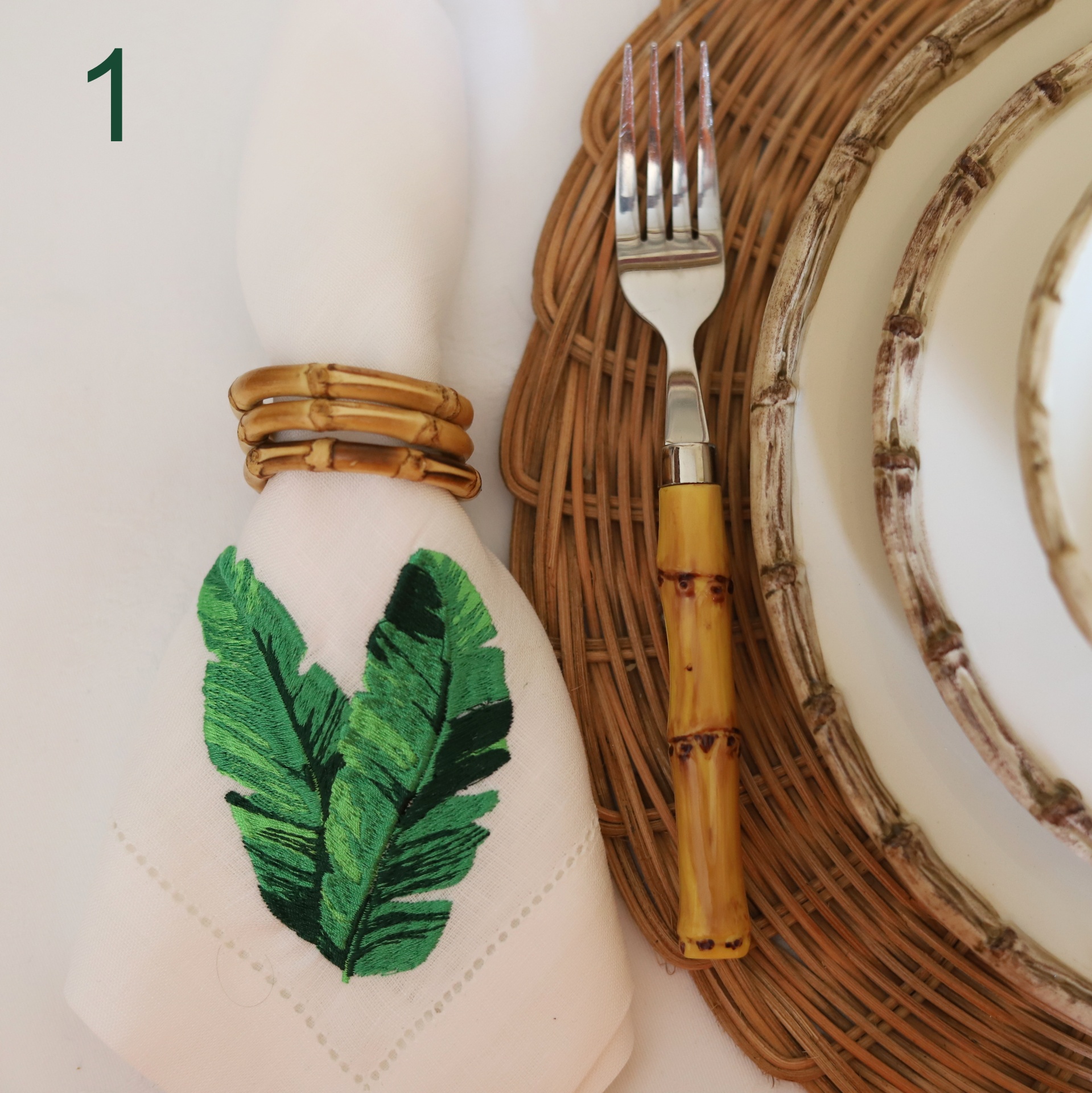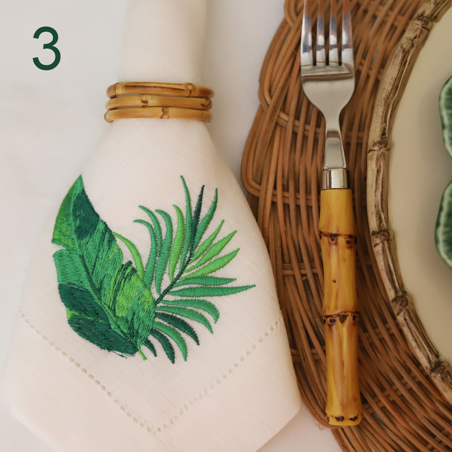 • Toalha branca com folhas verdes bordadas, argola de bambu, garfo com cabo amarelo e prato de vime