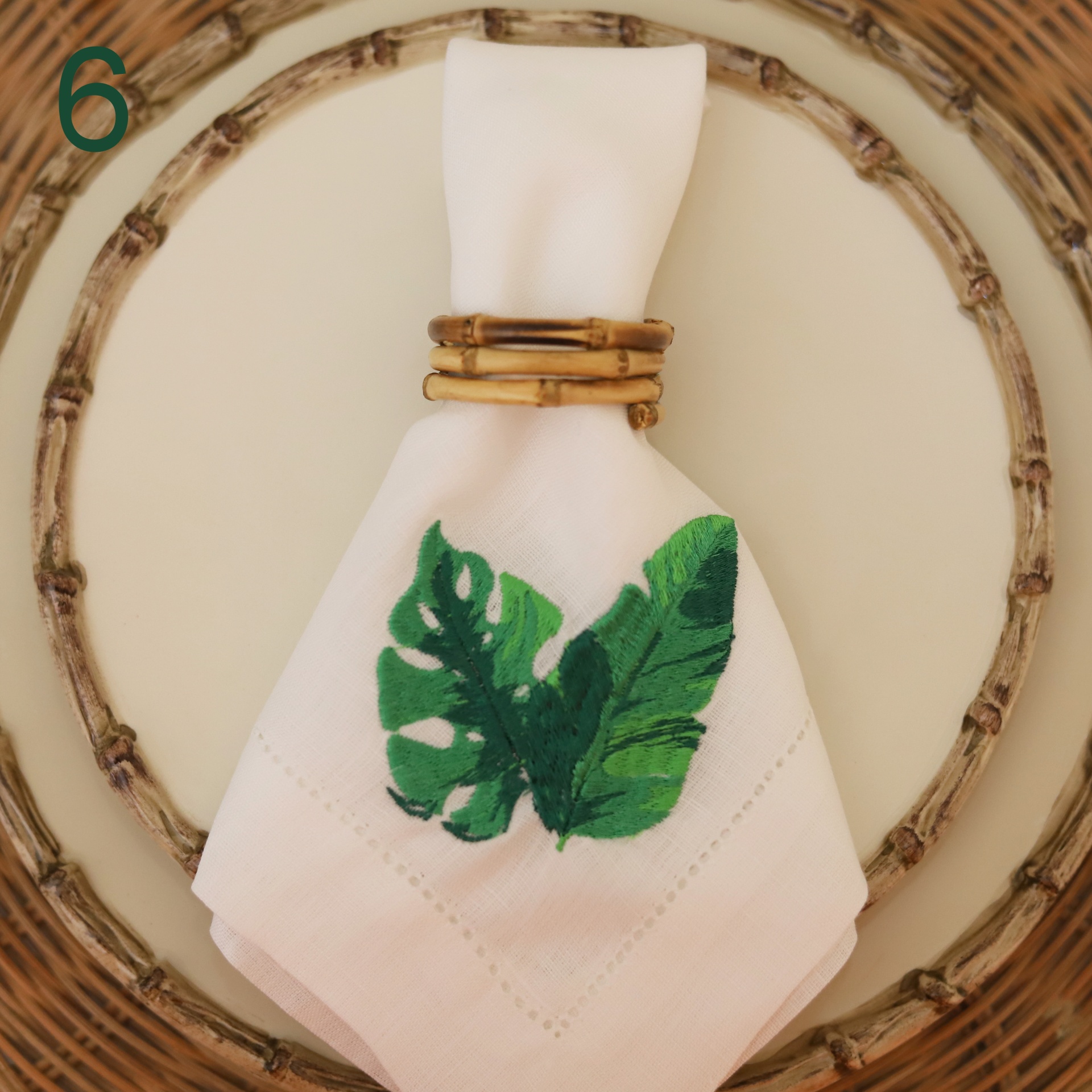 • Guardanapo branco com bordado de folhas verdes e argola de bambu em prato branco com sousplat de vime