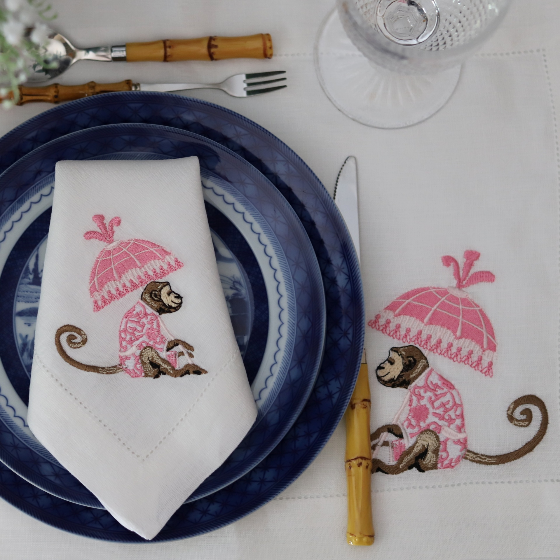 • Mesa posta com pratos azuis, guardanapo e toalha brancos com bordados de macacos cor-de-rosa, talheres com cabo de imitação de bambu e copo transparente.