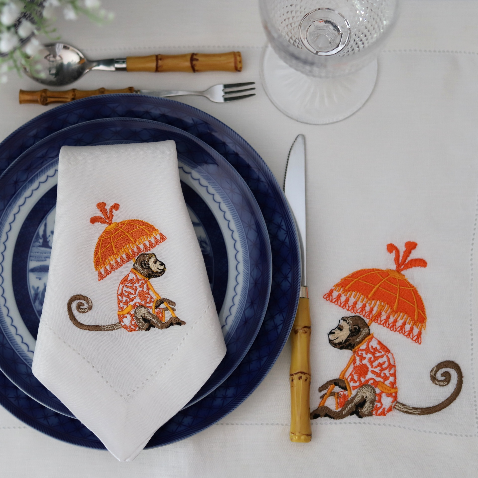 • Jogo americano branco com guardanapo e bordado de macaco com guarda-chuva laranja, prato azul e talheres com cabos de bambu.