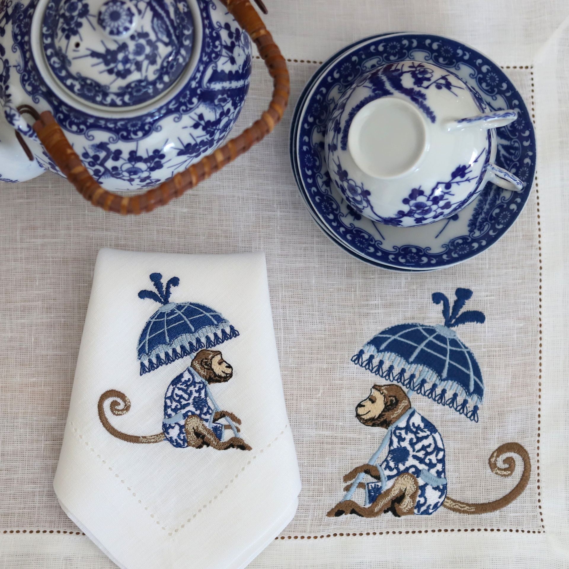 • Conjunto de chá azul e branco com padrão floral e toalha branca bordada com macaco e guarda-chuva azul