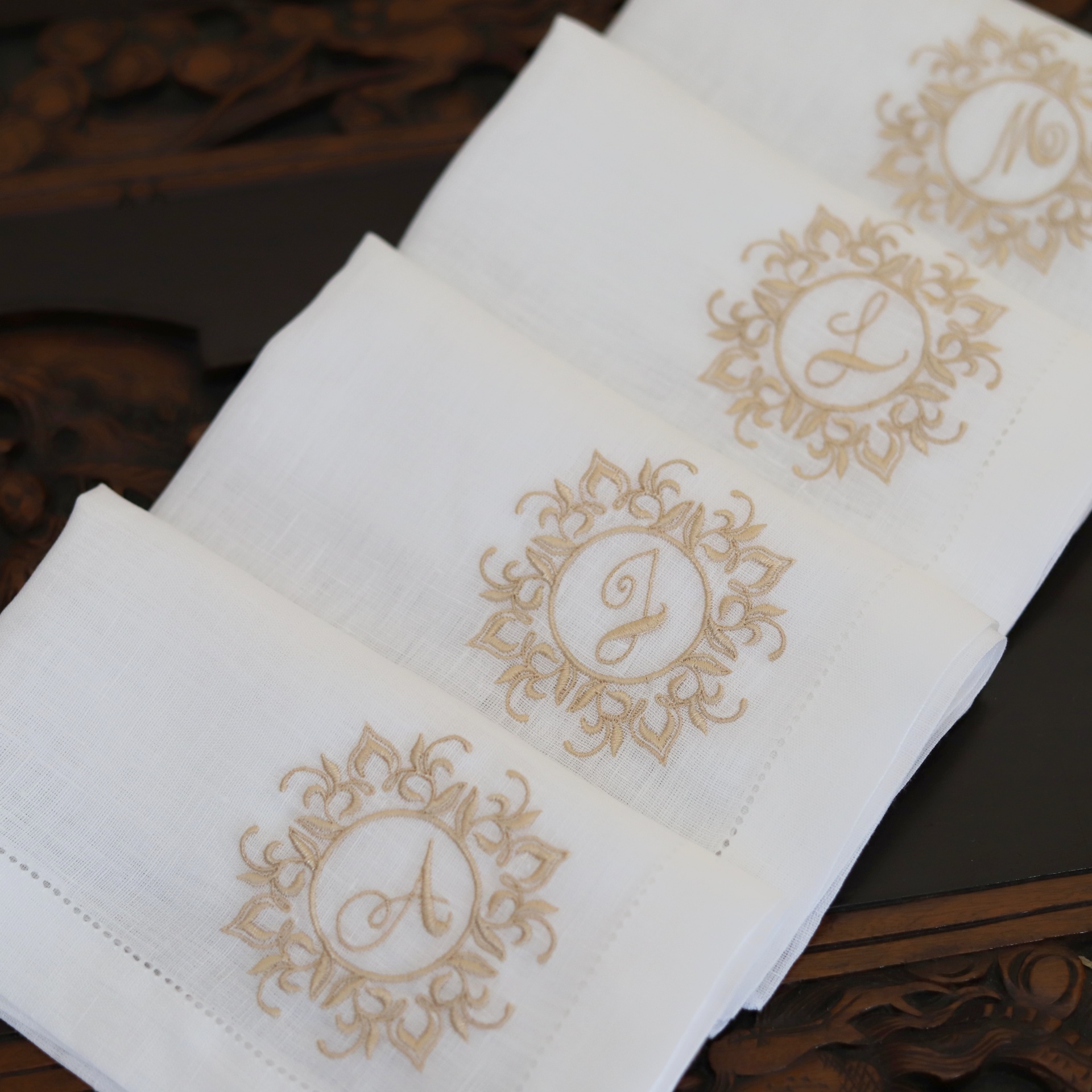 • Quatro guardanapos brancos com bordados dourados de iniciais A, J, L e M sobre madeira entalhada
