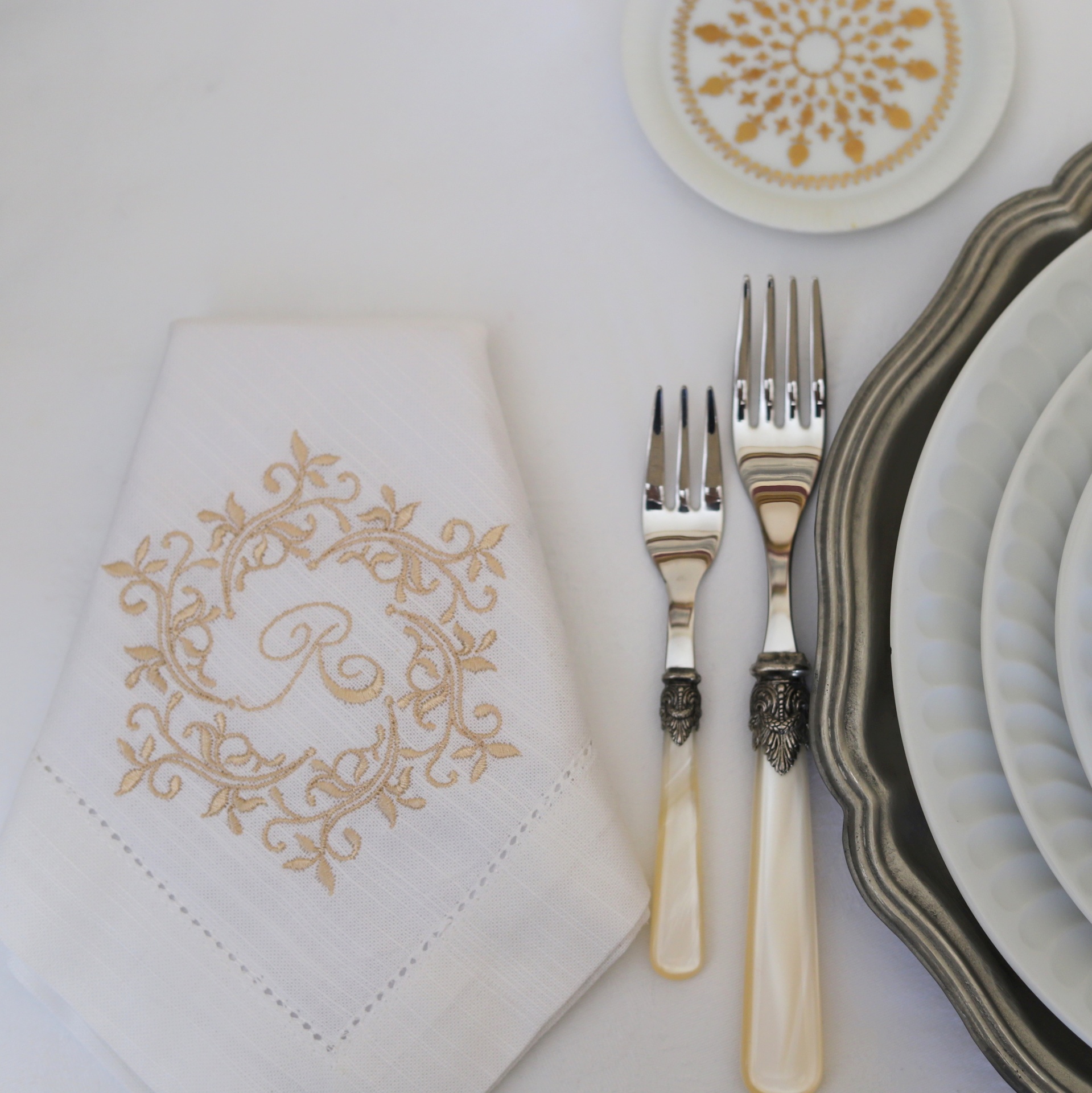 Toalha branca com bordado dourado, garfos com cabos brancos e pratos brancos e cinza