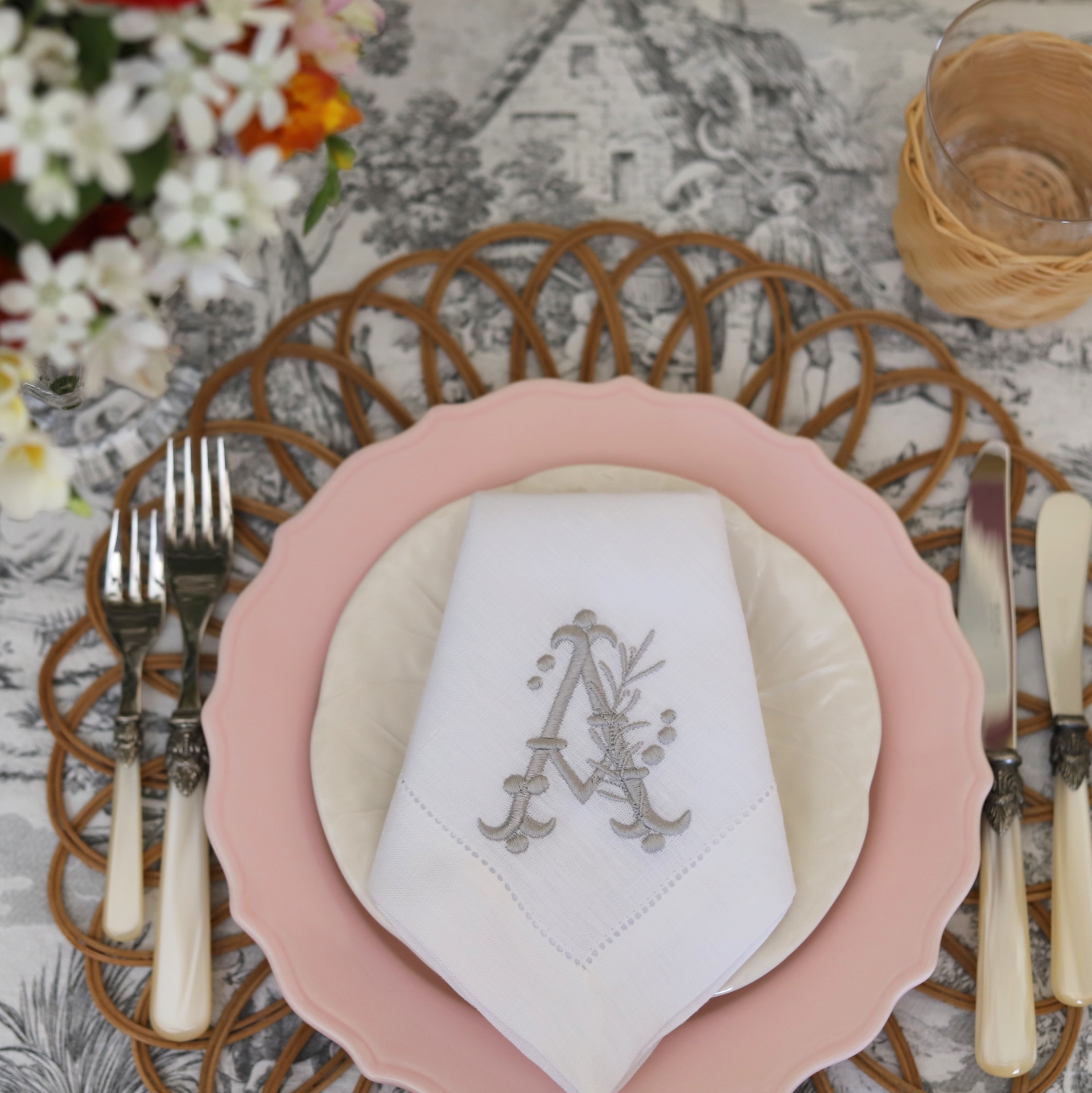 • Conjunto de mesa com prato rosa, prato branco, guardanapo branco com letra A bordada, talheres com cabos brancos, base em ráfia e copo de vidro