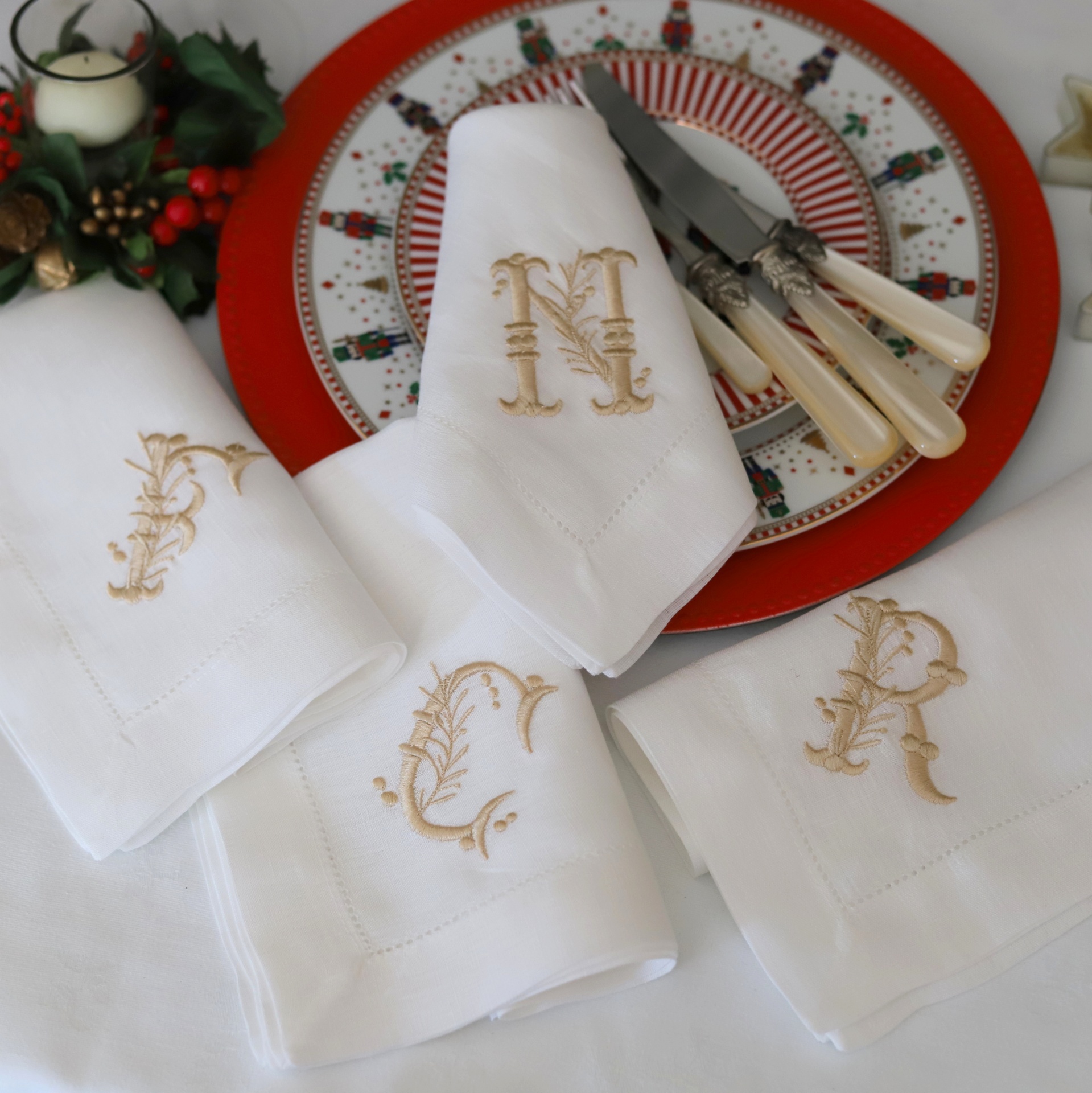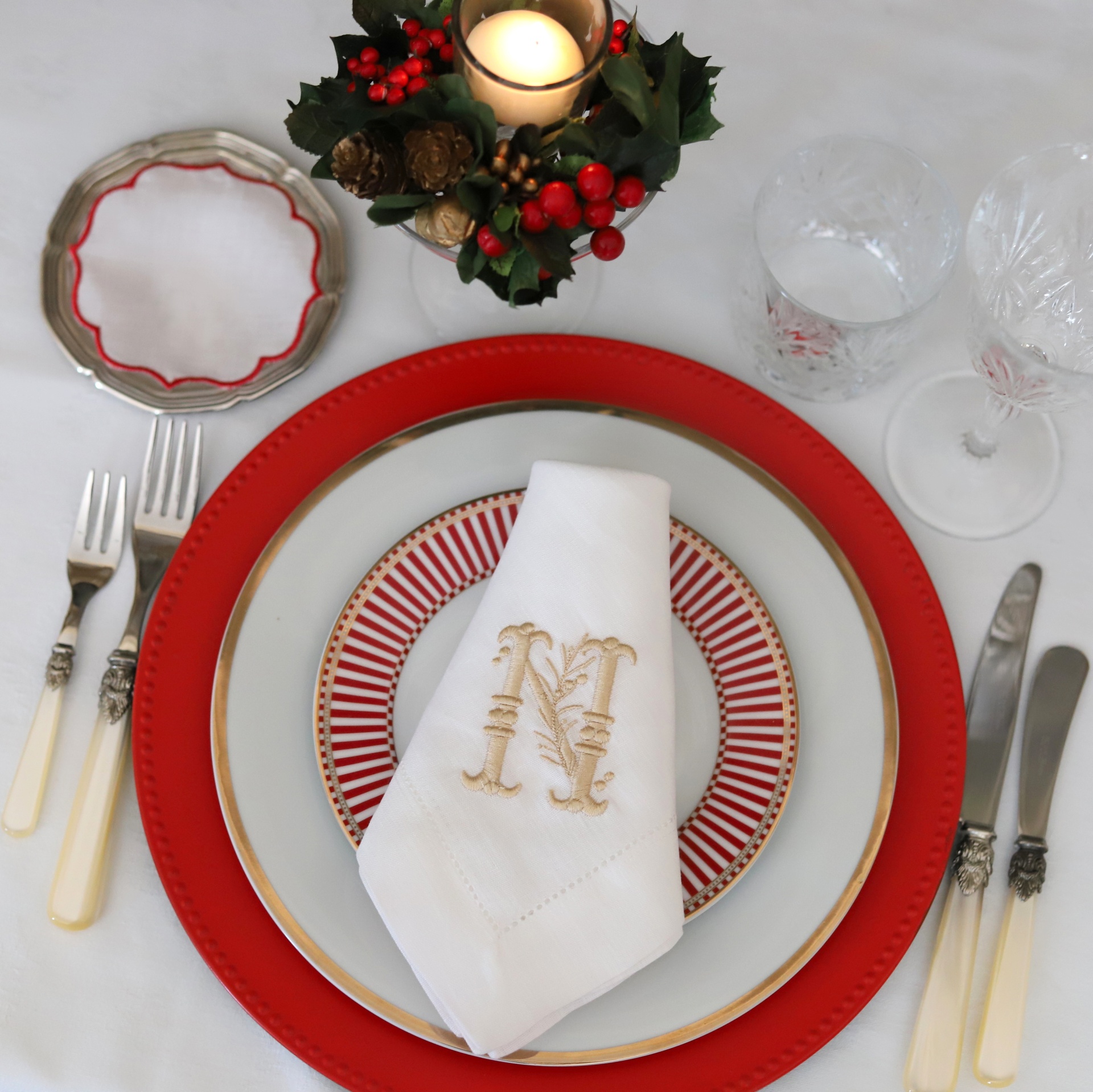 • Guardanapos brancos com iniciais douradas, prato decorativo vermelho e branco, talheres claros e arranjo natalício