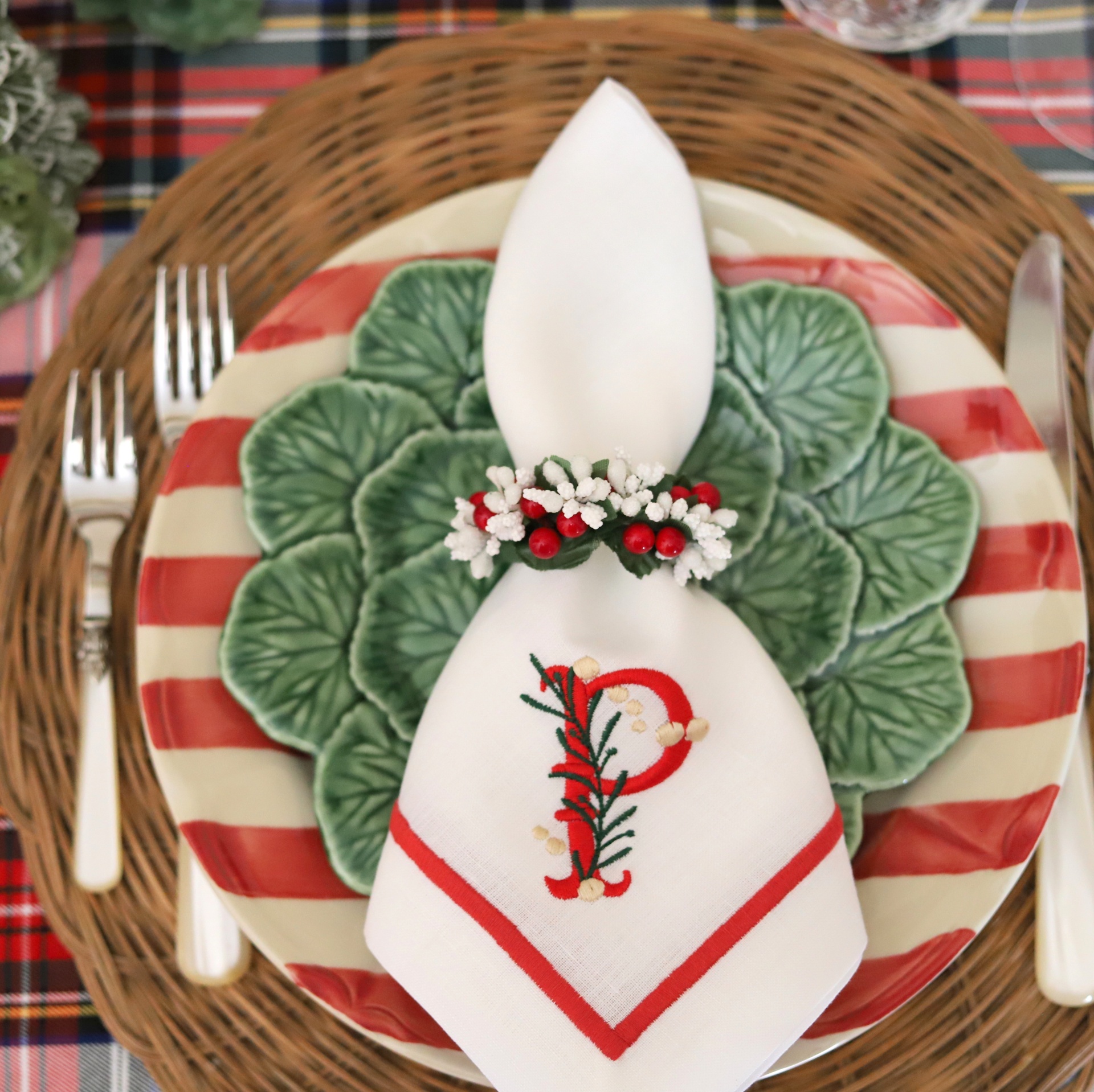 Conjunto de jantar com prato branco, prato verde com textura de folhas, guardanapo branco bordado e talheres com cabo creme, sobre base de rattan e toalha xadrez.