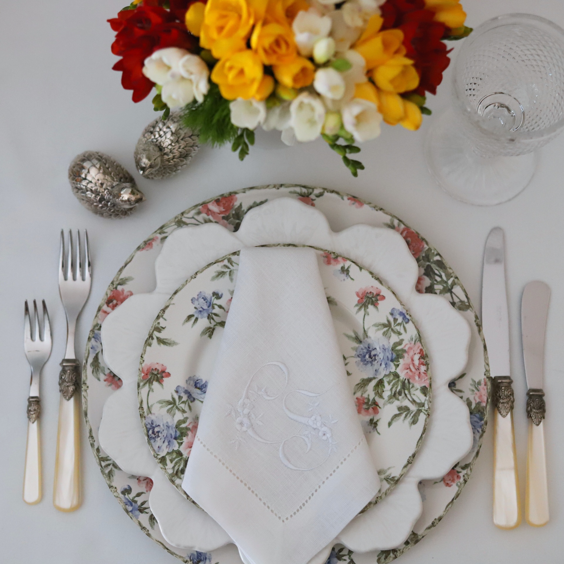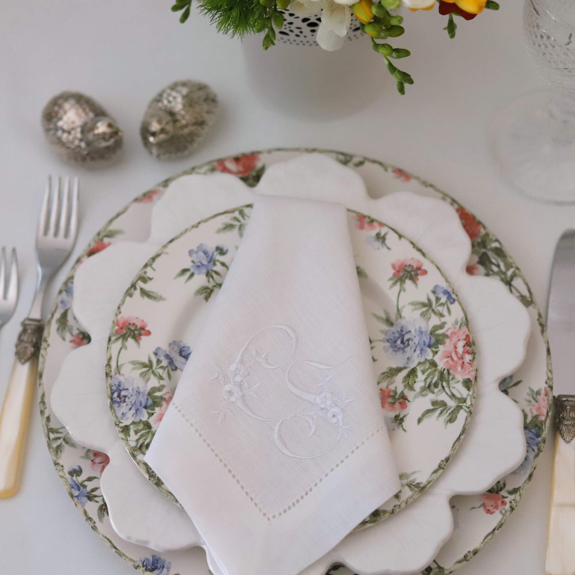 • Mesa posta com pratos florais, guardanapo branco bordado e talheres com cabos creme