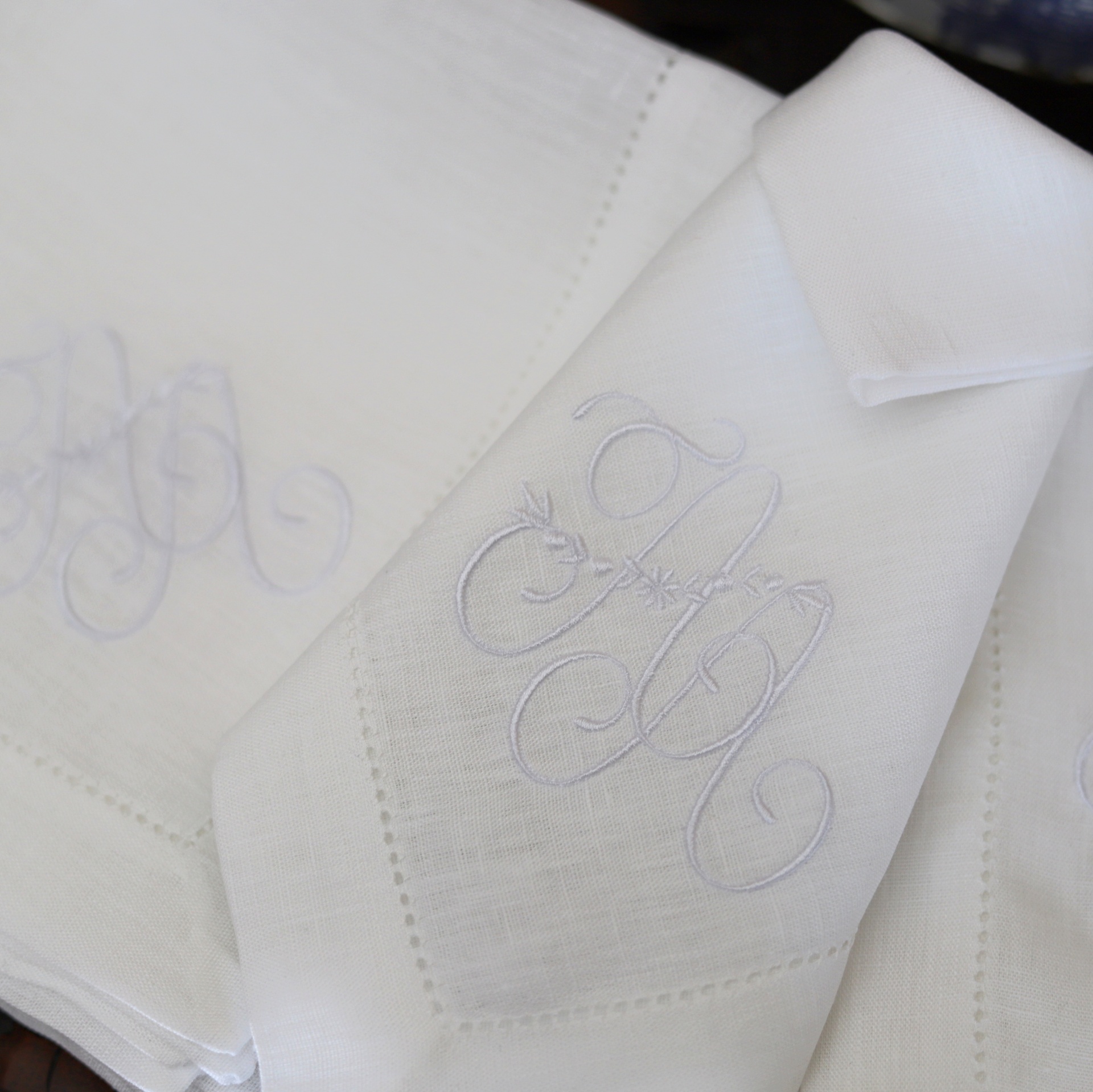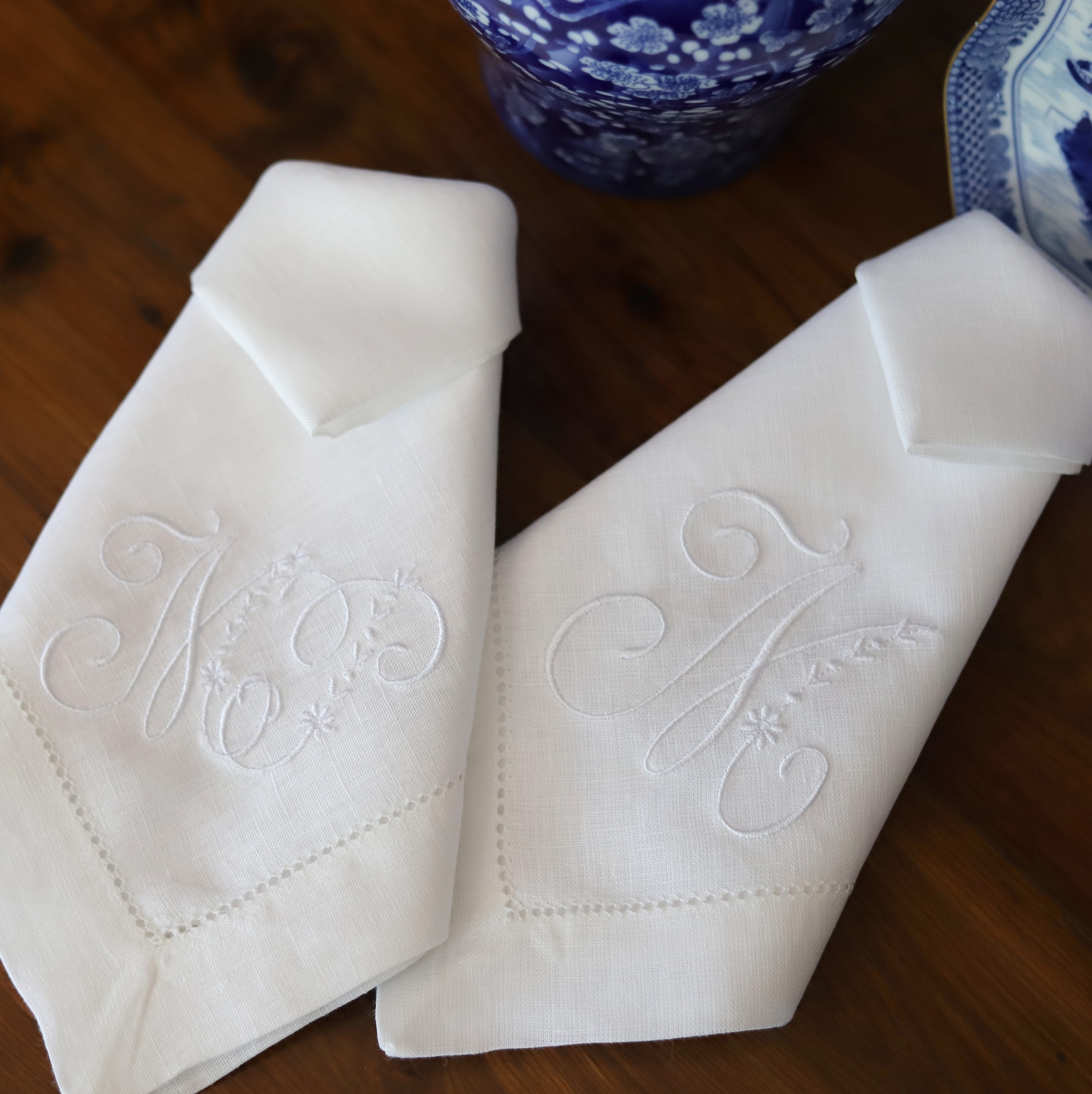 • dois guardanapos de tecido branco bordados com letras sobre superfície de madeira, com cerâmica azul ao lado