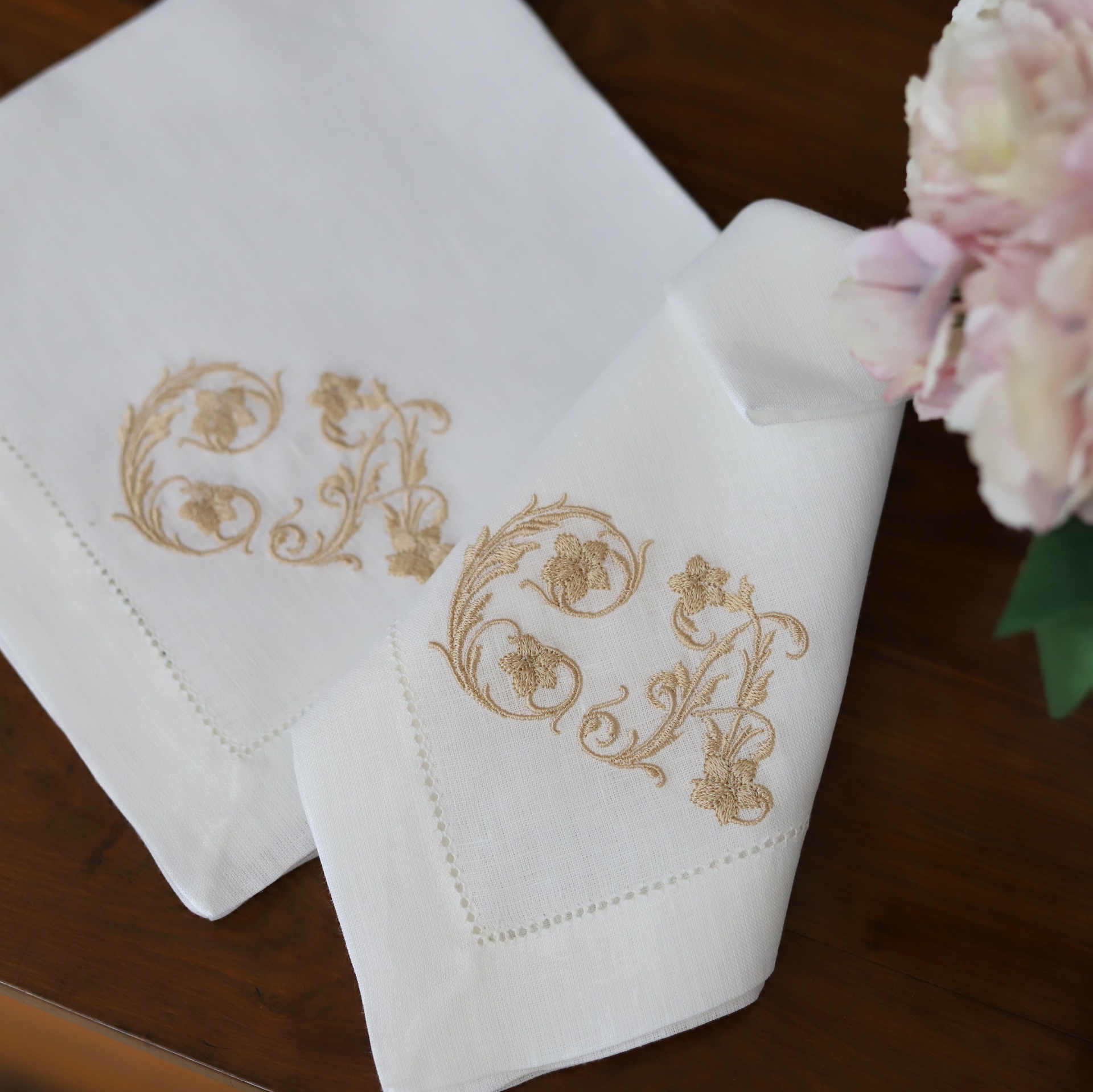 • Guardanapos brancos com bordado dourado das letras C e A ao lado de flores cor-de-rosa