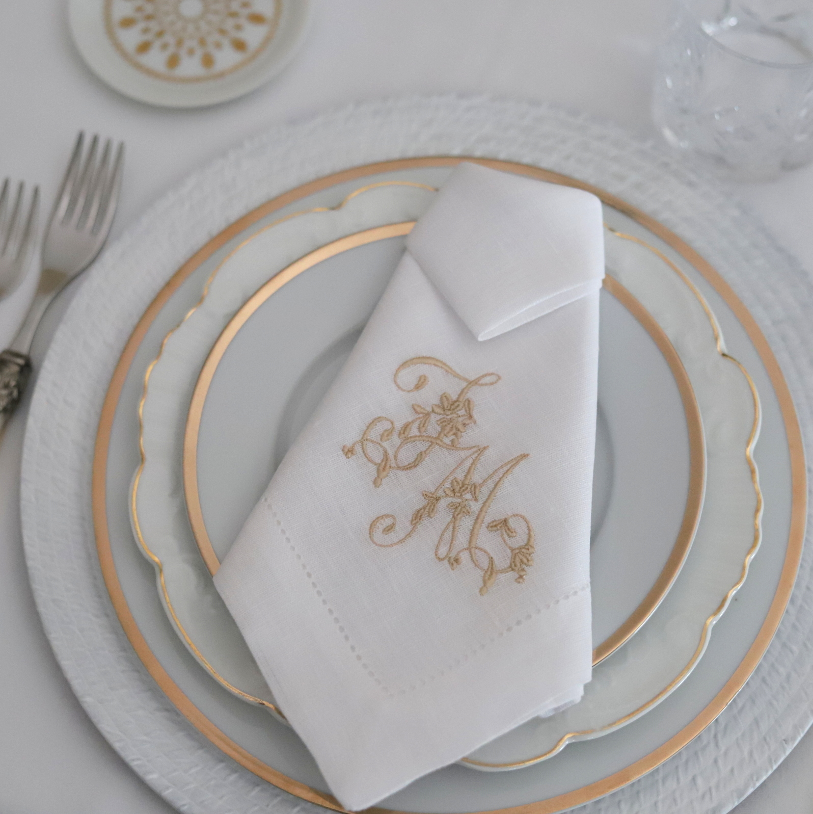 • Pratos com bordas douradas, guardanapo branco com monograma AM, talheres e copo num lugar de mesa