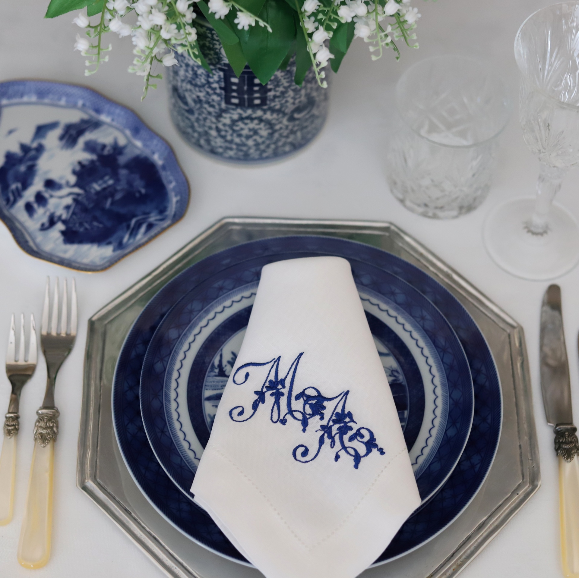 • Mesa posta com loiça azul e branca, guardanapo bordado e talheres brancos e prateados