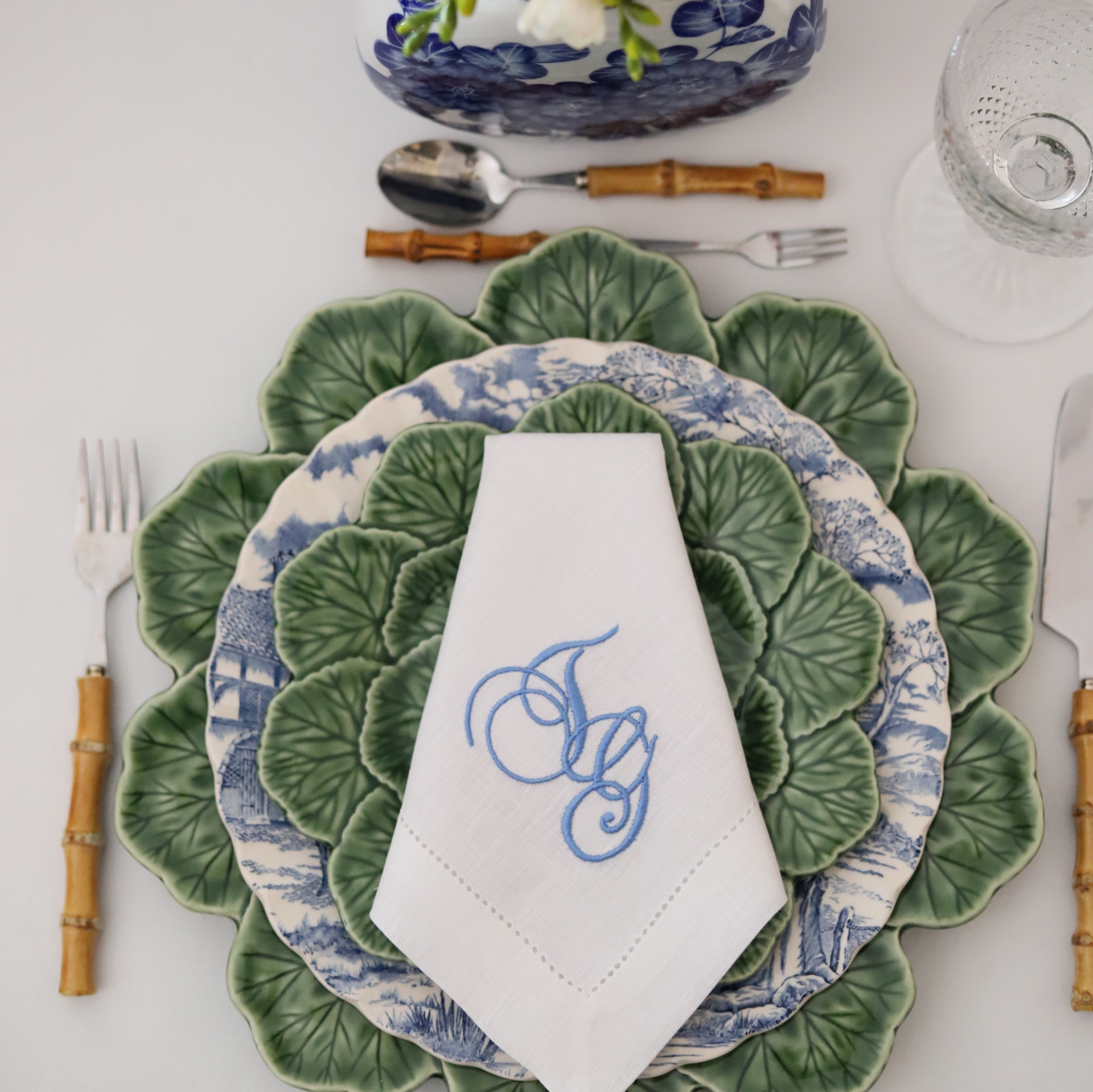 • Conjunto de pratos verdes e azul com guardanapo branco e talheres de cabo bambu