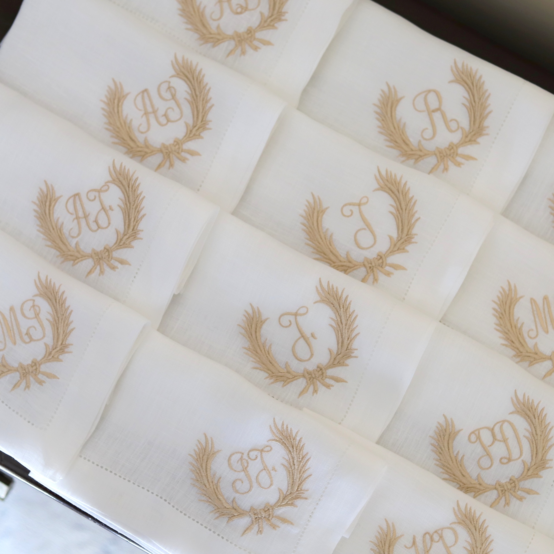 • Guardanapos brancos bordados com letras douradas e moldura de ramos de folhas.