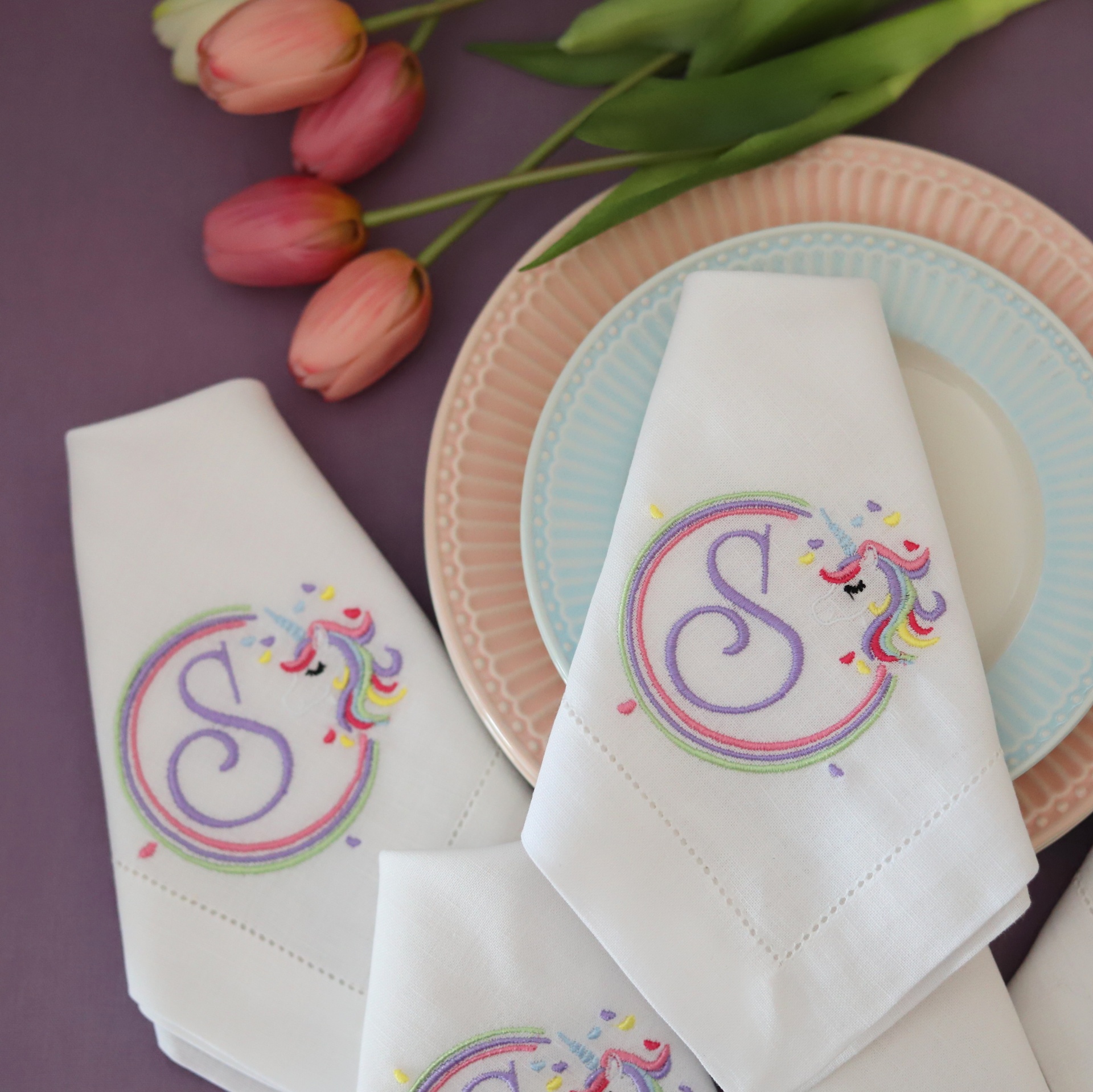 Guardanapos brancos com bordado colorido e pratos pastel juntamente com tulipas