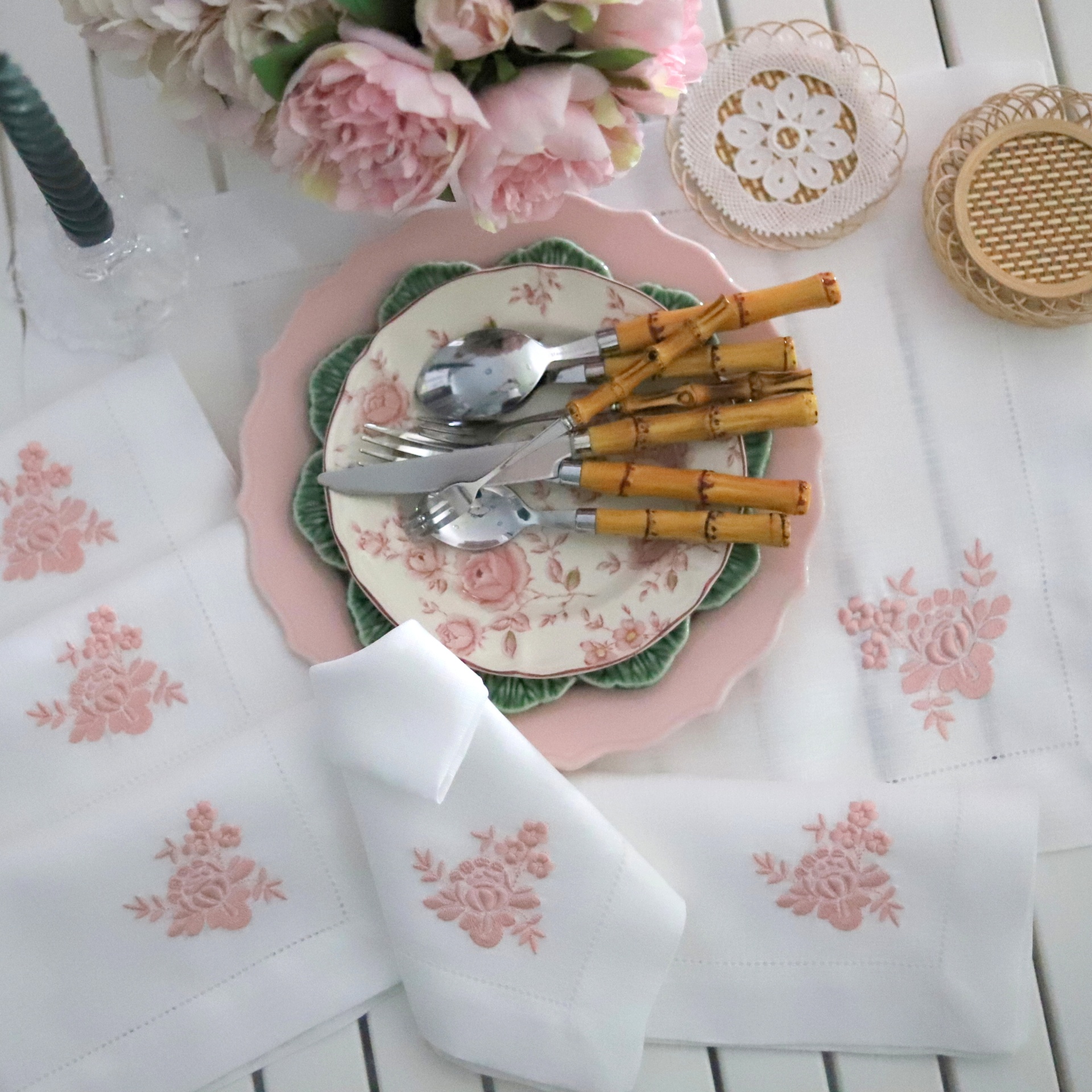 • Conjunto de pratos e talheres com cabos de bambu sobre toalhas brancas bordadas com flores cor-de-rosa
