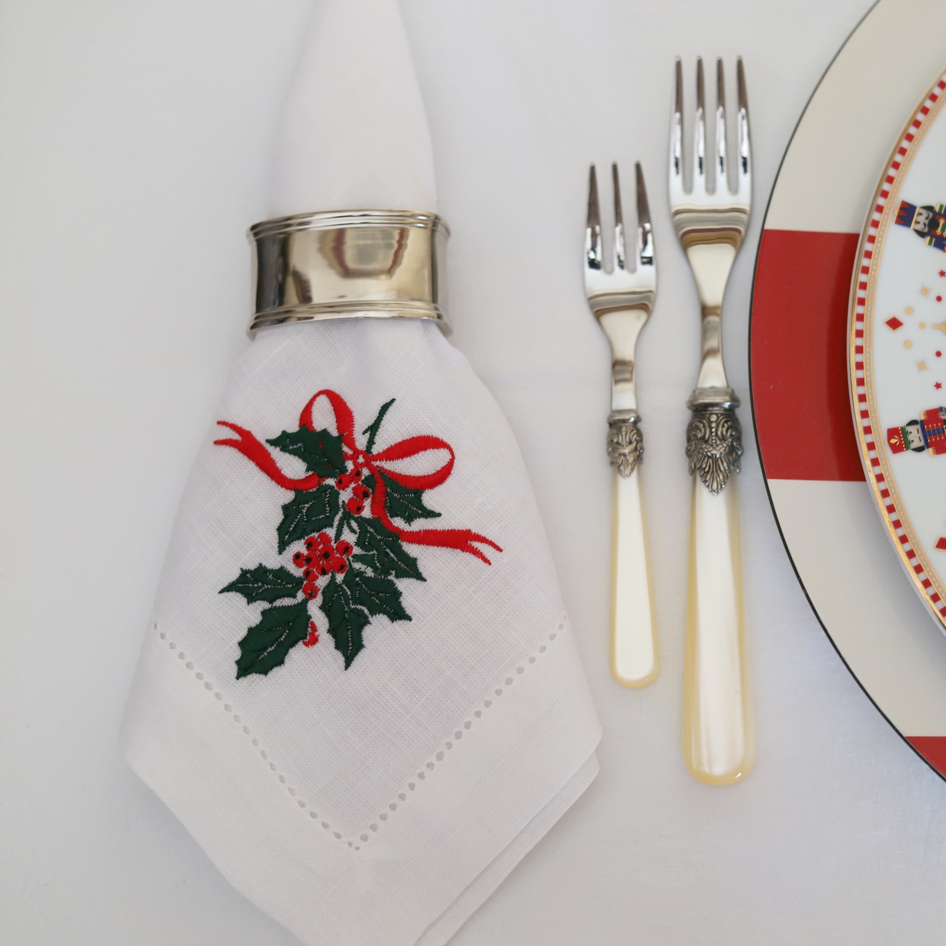 • Guardanapo branco bordado com azevinho, anel metálico, dois garfos com cabos decorativos e prato com soldados de chumbo