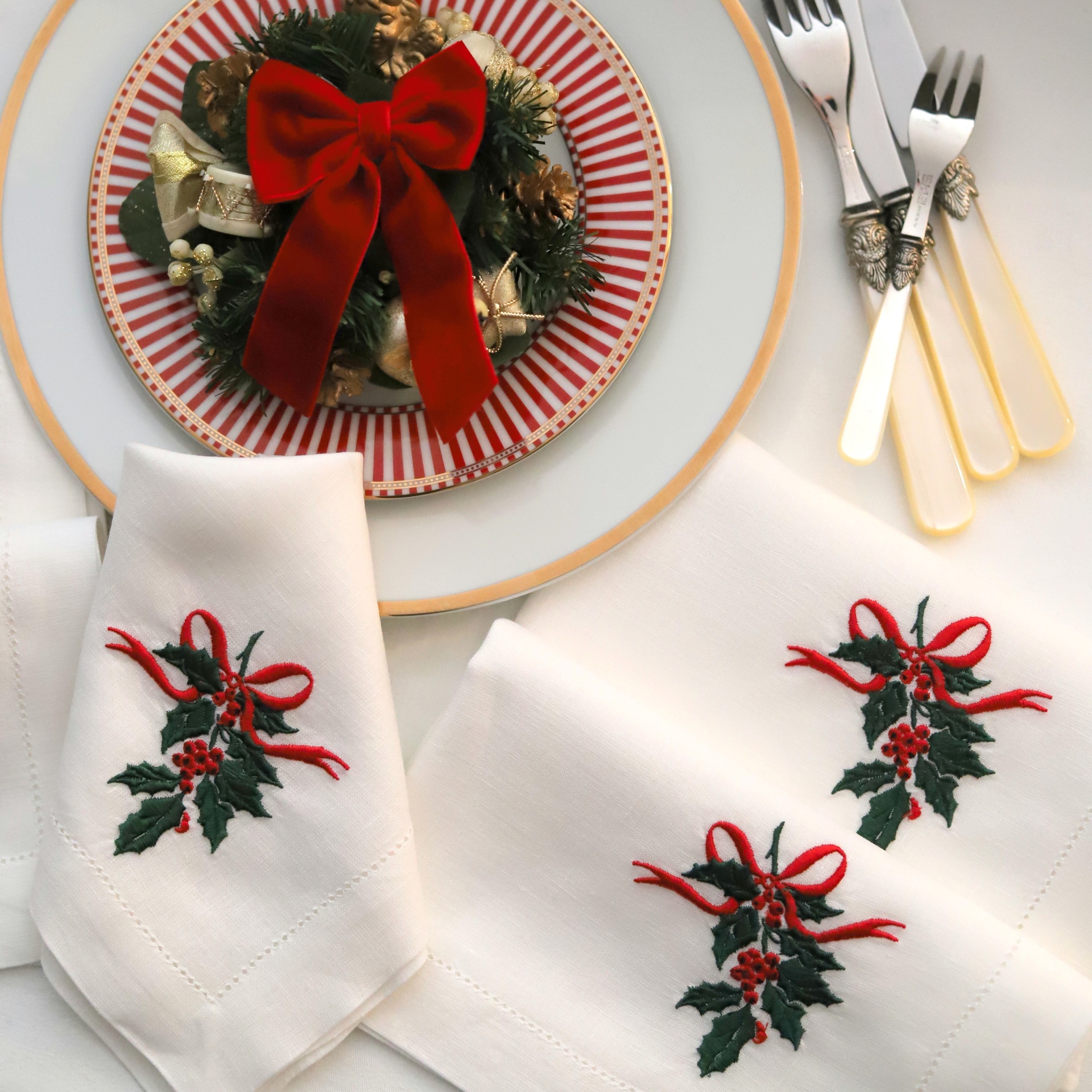 • Guardanapos brancos bordados com folhas e bagas vermelhas junto de prato decorado e talheres com cabo creme
