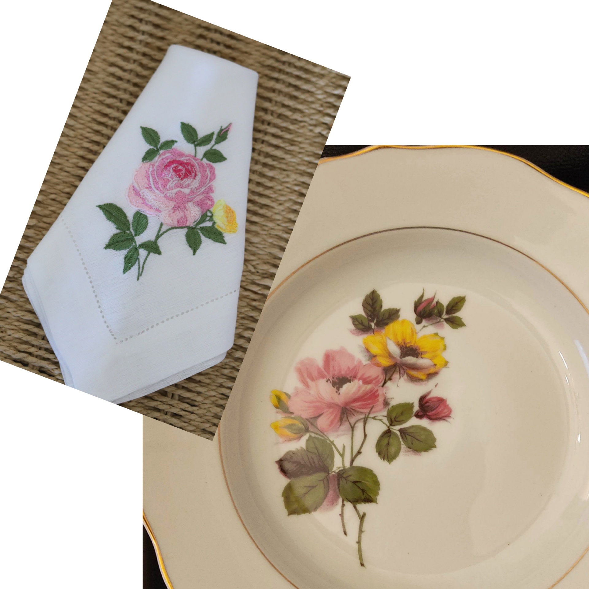 • Guardanapo branco com rosa estampada e prato porcelana com flores coloridas e borda dourada